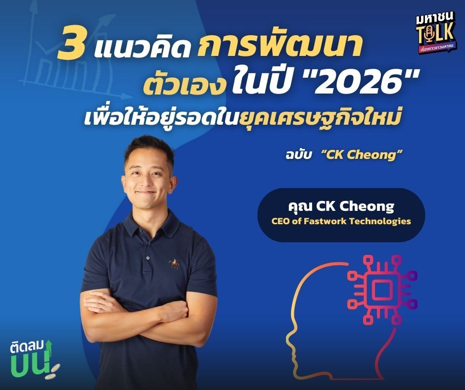 ‘ไต้ฝุ่น’ พาไปพุดคุย แชร์มุมมอง ของ “ซีเค เจิง” พร้อมฝากแง่คิด โจทย์ใหม่ของคนทํางาน และการทําธุรกิจในยุคนี้ ห้ามพลาด “ติดลมบน” วันพุธ 4 กุมภาพันธ์นี้สัปดาห์นี้ รายการพอดแคสต์ ติดลมบน ภายใต้โปรเจกต์ “มหาชนTalk” พิธีกรคนเก่ง ไต้ฝุ่น-ตากเพชรเลขาวิจิตร จะพาไปพบกับการกลับมาอีกครั้ง ของ “CK Cheong” ผู้ที่อยู่ในโลกของการสร้างธุรกิจ และการลงทุน ท่ามกลางความผันผวนของเศรษฐกิจ เป็นนักลงทุน ผู้ประกอบการ และ CEO แห่ง Fastwork Group