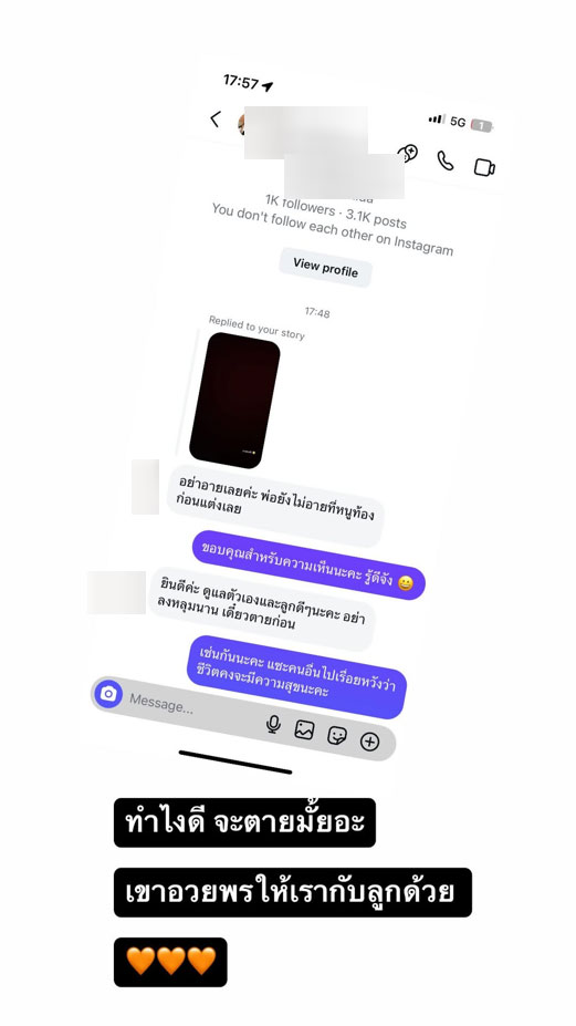 นอกจากนี้เธอยังแคปข้อความที่ชาวเน็ตเข้ามาแขวะเรื่อง "ท้องก่อนแต่ง" โดยเธอก็ตอบกลับว่า "ขอบคุณสำหรับความเห็นนะคะ รู้ดีจัง"
