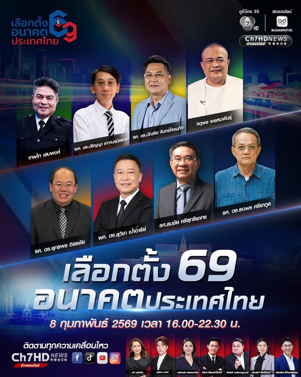 และห้ามพลาด ! ตั้งแต่เวลา 16.00 น. เป็นต้นไป ชมสดพร้อมกันในรายการพิเศษ “เลือกตั้ง 69 อนาคตประเทศไทย” ที่ระดมกำลังทีมผู้ประกาศข่าวมากประสบการณ์ นำโดย กาย-สวิตต์ ลีละพงศ์วัฒนา, อ.ยิ่งศักดิ์ จงเลิศเจษฎาวงศ์,ศจี วงศ์อำไพ, กฤษ-กฤษดา นวลมี, ฝัน-เหมือนฝัน ประสานพานิช, ปุ้ม-เปรมสุดา สันติวัฒนา และ แชมป์-ศรัณภัสร์ตั้งไพศาลธนกุล ร่วมถ่ายทอดข้อมูลอย่างรอบด้าน ชัดเจน และเข้าถึงง่าย พร้อมด้วยบทวิเคราะห์จากกูรูแถวหน้า ถอดรหัสคะแนนเสียงชำแหละเกมการเมืองแบบที่ไม่มีใครกล้าฟันธง ด้วยการวิเคราะห์จากนักวิชาการและผู้ทรงคุณวุฒิด้านการเมือง อาทิ ผศ.ดร.สุวิชา เป้าอารีย์, รศ.สมชัย ศรีสุทธิยากร, รศ.ดร.ยุทธพร อิสรชัย, รศ.ดร.ธนพร ศรียากูล, ผศ.ดร.ปริญญา เทวานฤมิตรกุล, เทพไท เสนพงศ์, รศ.ดร.บัณฑิต จันทร์โรจนกิจ และ จตุพร พรหมพันธ์ ร่วมถอดรหัสสถานการณ์ วิเคราะห์ทิศทางการเมืองและผลกระทบต่ออนาคตประเทศติดตามชม รายการพิเศษ “เลือกตั้ง 69 อนาคตประเทศไทย” ในวันอาทิตย์ที่ 8 กุมภาพันธ์นี้ ตั้งแต่เวลา 16.00 น. ทางช่อง 7HD กด 35 และสามารถติดตามข่าวสารความเคลื่อนไหว เลือกตั้ง 69 ได้ทาง ช่อง 7HD ดูทีวีกด 35 สดออนไลน์ BUGABOO.TV และช่องทางออนไลน์ Ch7HD NEWS (Facebook, IG, Tiktok) Ch7HD (Facebook, IG, TikTok, X และ YouTube) และเว็บไซต์ www.ch7.com/election2569