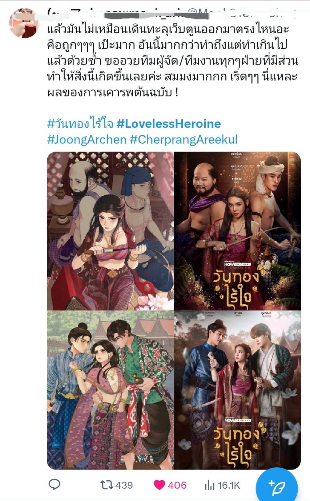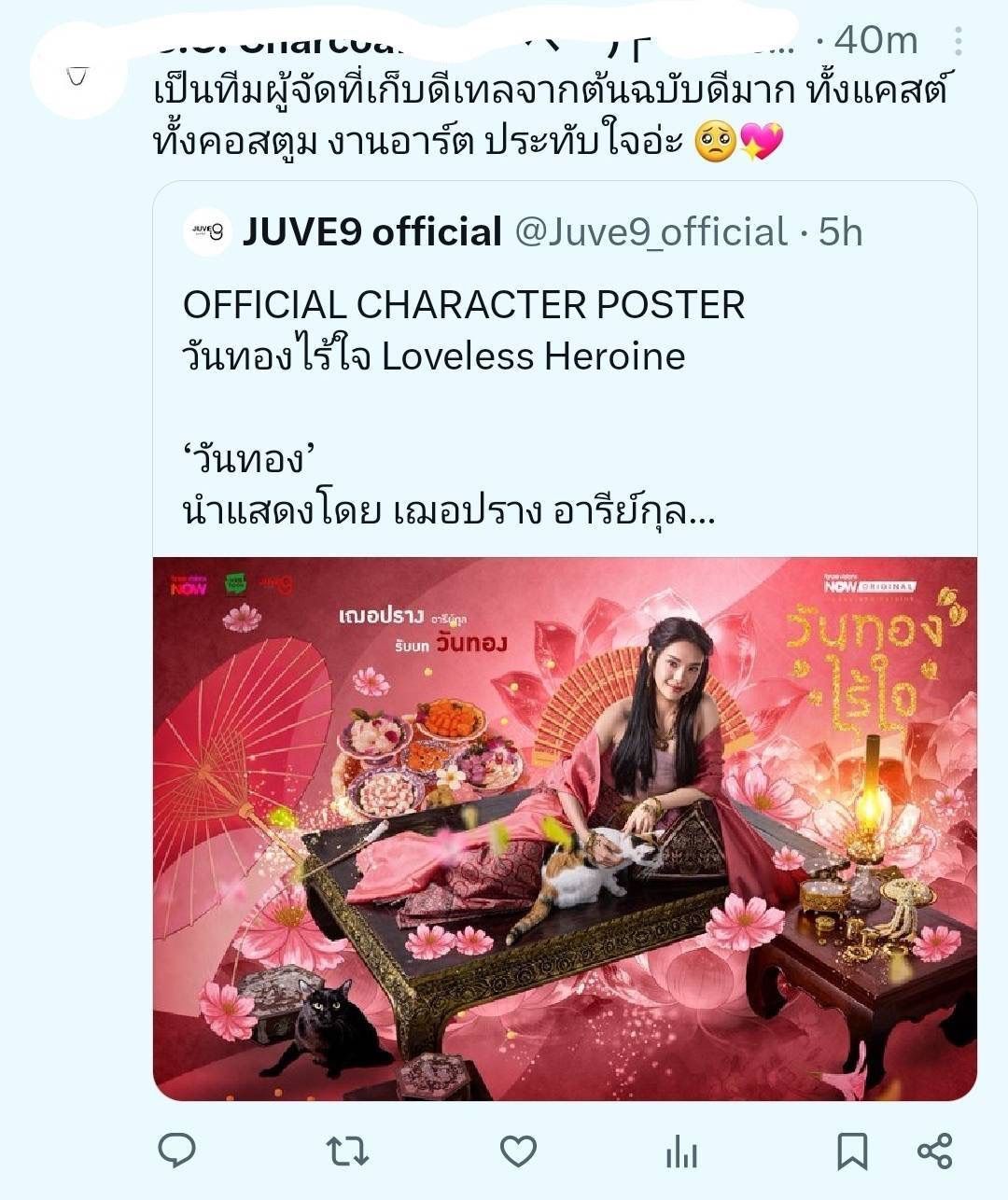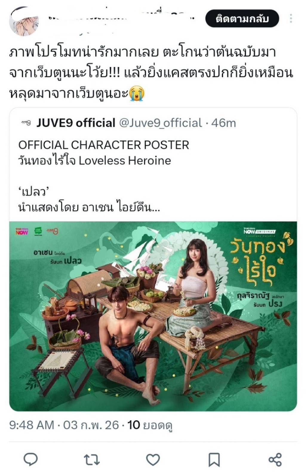 เรียกเสียงฮือฮาตั้งแต่เปิดโผรายชื่อนักแสดงสำหรับซีรีส์ฟอร์มยักษ์ “วันทองไร้ใจ” Live Action เว็บตูนชื่อดังจาก LINE WEBTOON หนึ่งในผลงานที่โดดเด่นและได้รับความนิยมจากนักอ่านทั่วโลก การันตีด้วยยอดวิวกว่า 73.9 ล้านครั้ง จากความร่วมมือของ ทรูวิชั่นส์ นาว จับมือ JUVE9 และWEBTOON Productionsสร้างสรรค์ผลงานชิ้นโบว์แดงนี้ขึ้นมา ที่งานนี้บอกเลยว่าแค่เพียงเปิดตัวนักแสดงก็ทำเอาโซเชียลสนั่นกับความแคสตรงปก ตรงใจแฟนWEBTOON กันสุดๆ ทางผู้จัดไม่ปล่อยให้รอนานปล่อยภาพโปสเตอร์แนะนำตัวละครมาเอาใจแฟนซีรีส์ให้ดูกันแบบจุกๆ กันไปเลย