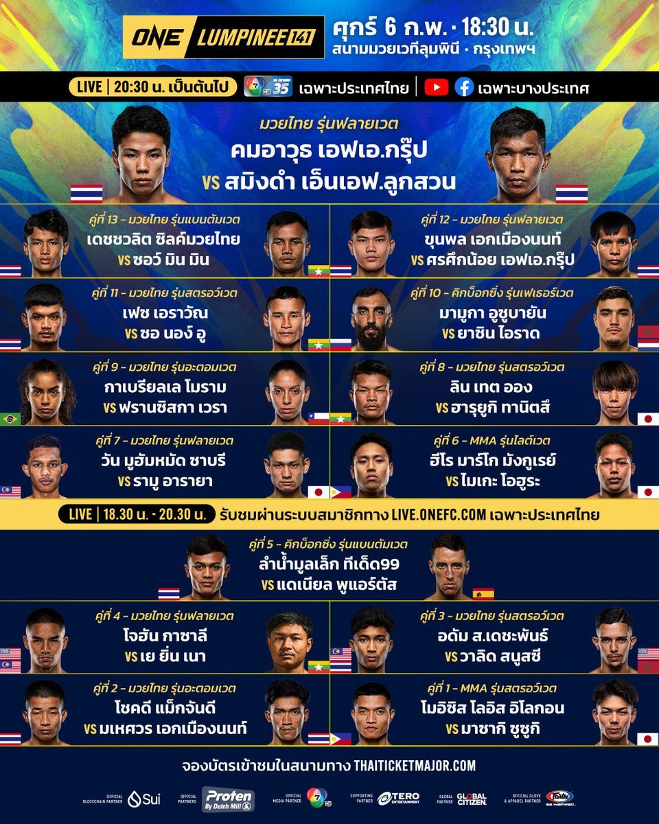 สนุกเร้าใจแฟนมวยสุด ๆ สำหรับ ONE ลุมพินี 141 เมื่อคืนวันศุกร์ที่ 30 มกราคมที่ผ่านมา ฟาดเรตติงจากผู้ชมสนั่นจอ โดยผู้ชมทั่วประเทศ 15+ เรตติ้งทะยานสูงถึง 3.5 ผู้ชมทั่วประเทศ (All 4+) 3.2 และผู้ชมเพศชายอายุ 15 ปีขึ้นไป พุ่งทะยานสูงถึง 4.3 (ข้อมูลจาก Nielsen วันที่ 2 กุมภาพันธ์ 2569)และ ใน วันศุกร์ที่ 6 กุมภาพันธ์นี้ ตามติดความเร้าใจกันต่อ ช่อง 7HD ส่งตรงความมันต้อนรับเดือนแห่งความรัก จัดโปรแกรมมวยเดือด 2 เวที รายการ ONE ลุมพินี 141 ส่งคู่เอกประจำรายการ คมอาวุธ เอฟเอ.กรุ๊ป นักชกสายแข็งจากหนองคาย ได้คิวให้กลับมาพิสูจน์ฝีมือบนเวทีแห่งนี้อีกครั้ง พบกับ สมิงดำ เอ็นเอฟ.ลูกสวน มวยฟอร์มปังจากจันทบุรีในกติกามวยไทย รุ่นฟลายเวต ขณะที่คู่รอง เดชชวลิต ซิลค์มวยไทย ดาวรุ่งไฟแรง จากชลบุรี ลุ้นยืดไร้พ่ายเป็นไฟต์ที่ 3ในรายการ ปะทะ ซอว์ มิน มิน จอมบู๊สายแข็ง จากเมียนมา ที่ตั้งเป้าอยากคว้าชัย 2 ไฟต์ติดให้ได้ ภายใต้กติกามวยไทย