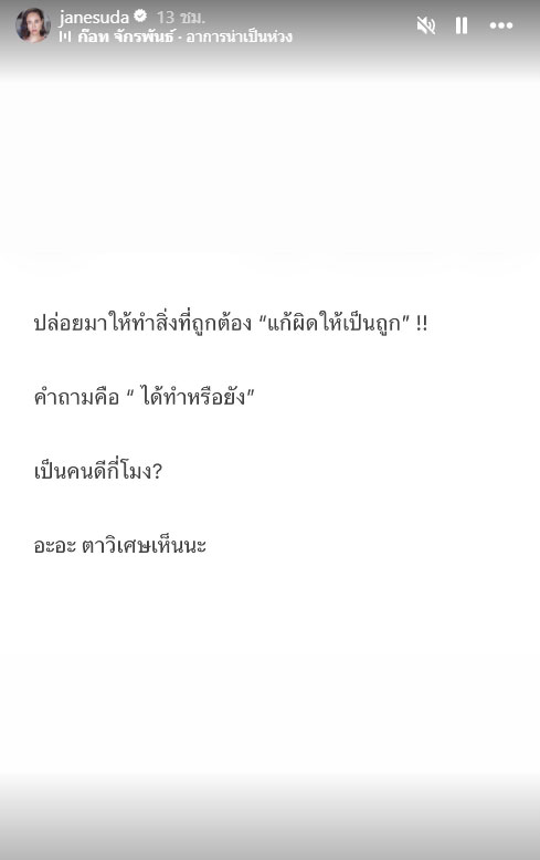 โดยในไอจีสตอรี่ @janesuda ได้โพสต์ภาพ และเขียนข้อความว่า “ปล่อยมาให้ทำสิ่งที่ถูกต้อง "แก้ผิดให้เป็นถูก" !! คำถามคือ "ได้ทำหรือยัง" เป็นคนดีกี่โมง? อะอะ ตาวิเศษเห็นนะ”