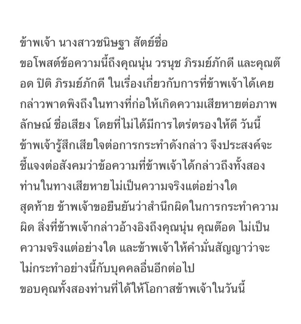 "ข้าพเจ้า นางสาวชนิษฐา สัตย์ซื่อ ขอโพสต์ข้อความนี้ถึงคุณนุ่น วรนุช ภิรมย์ภักดี และคุณต๊อด ปิติ ภิรมย์ภักดี ในเรื่องเกี่ยวกับการที่ข้าพเจ้าได้เคยกล่าวพาดพิงถึงในทางที่ก่อให้เกิดความเสียหายต่อภาพลักษณ์ ชื่อเสียง โดยที่ไม่ได้มีการไตร่ตรองให้ดี