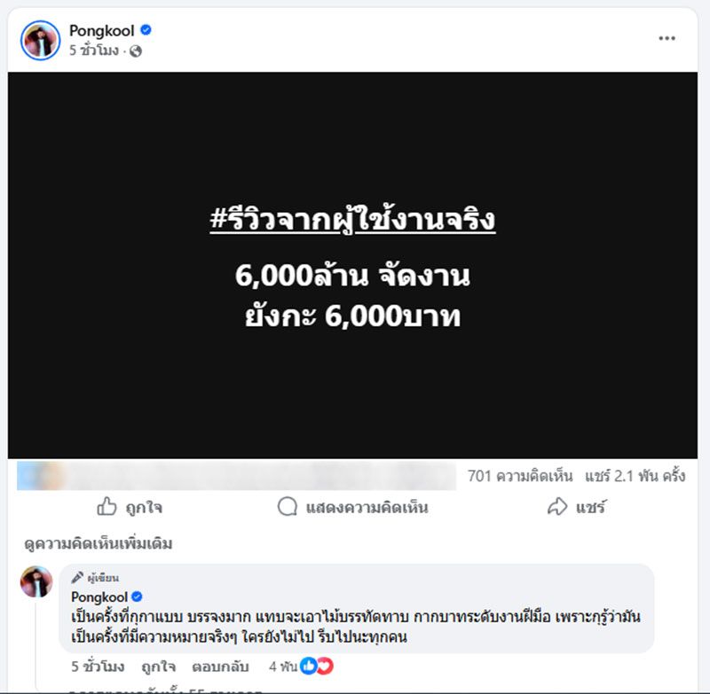 โดยระบุว่า “รีวิวจากผู้ใช้งานจริง 6,000 ล้าน จัดงานยังกะ 6,000 บาท”