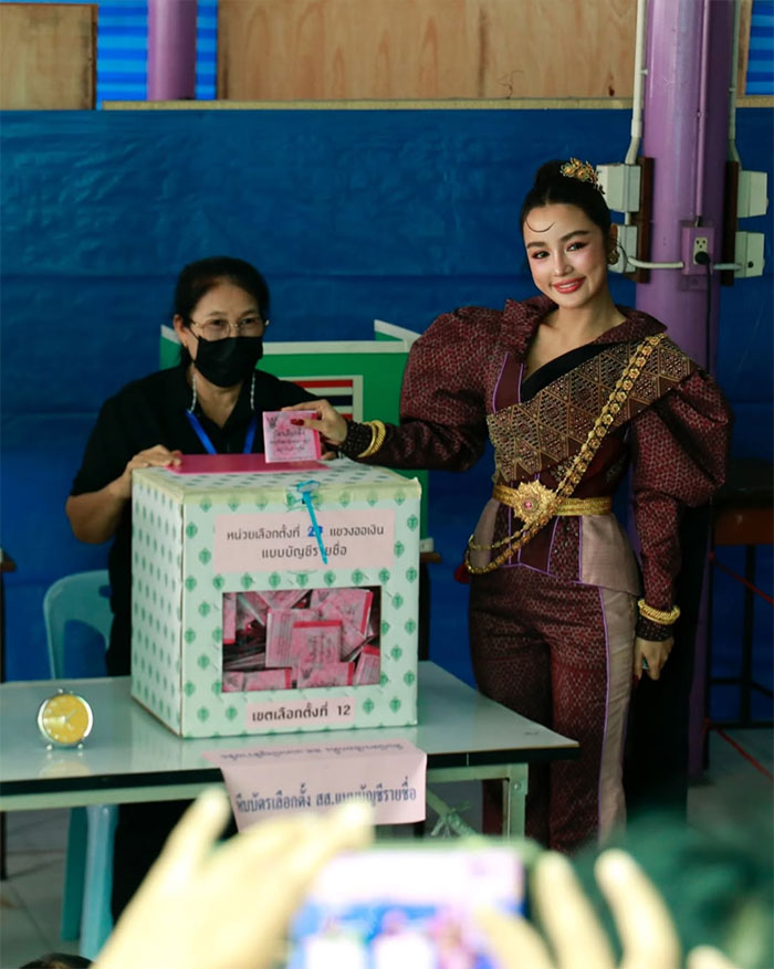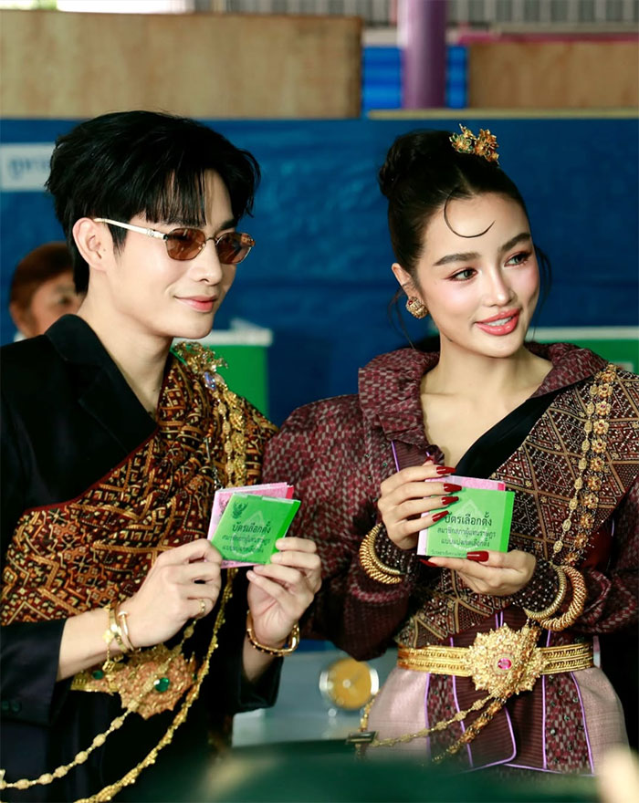โดยทั้งคู่ปรากฏตัวด้วยลุคโดดเด่น สวมชุดไทยผ้าไหมแพรวา จังหวัดกาฬสินธุ์ สวยงามสง่า สะดุดตาผู้พบเห็น และได้รับความสนใจจากประชาชนที่มาใช้สิทธิภายในหน่วยเลือกตั้งเป็นอย่างมาก