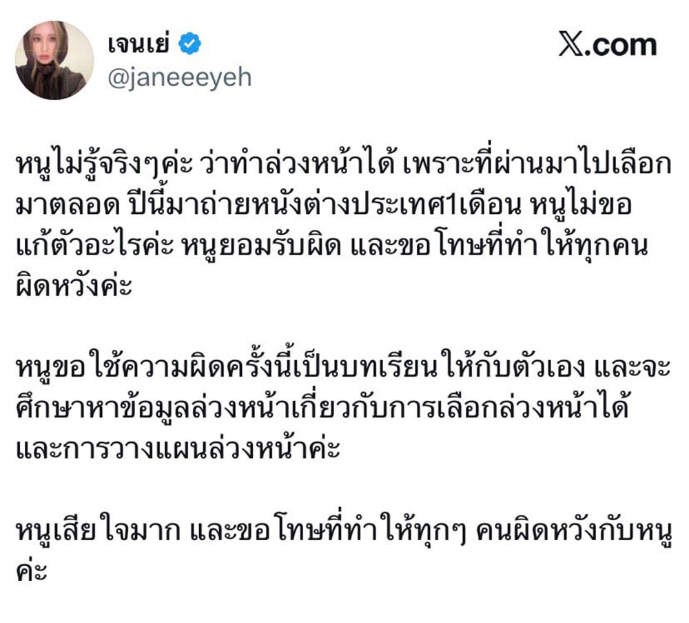 ล่าสุดเกิดดรามาสนั่นโลกออนไลน์เมื่อดาราวัยรุ่นชื่อดัง 'เจนเย่' เมธิกา จีรนรภัทร ได้ออกมาโพสต์ข้อความผ่านทางเอ็กซ์ส่วนตัว "@janeeeyeh" ระบุข้อความว่า "หนูไม่รู้จริงๆค่ะ ว่าทำล่วงหน้าได้ เพราะที่ผ่านมาไปเลือกมาตลอด ปีนี้มาถ่ายหนังต่างประเทศ 1 เดือน หนูไม่ขอแก้ตัวอะไรค่ะ หนูยอมรับผิด และขอโทษที่ทำให้ทุกคนผิดหวังค่ะ หนูขอใช้ความผิดครั้งนี้เป็นบทเรียนให้กับตัวเอง และจะศึกษาหาข้อมูลล่วงหน้าเกี่ยวกับการเลือกล่วงหน้าได้ และการวางแผนล่วงหน้าค่ะ หนูเสียใจมาก และขอโทษที่ทำให้ทุกๆ คนผิดหวังกับหนูค่ะ"