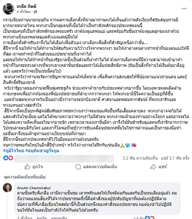 ต่อมา เพจเฟซบุ๊ก Anutin Charnvirakul ของอนุทิน ชาญวีรกูล ก็ได้มาตอบใต้คอมเมนต์ ว่า ตามนั้นครับพี่เกลือ เรามีความชื่นชม เคารพรักและให้เกียรติต่อกันและกันเป็นทุนเดิมอยู่แล้ว ผมถือว่าคะแนนเสียงที่ได้จากประชาชนครั้งนี้คือคำสั่งของผู้บังคับบัญชาที่ผมต้องปฏิบัติตาม ข้อความที่พี่เกลือเขียนโพสต์มานี้ก็เป็นส่วนหนึ่งของคำสั่งของประชาชน ผมต้องนำไปปฏิบัติ ขอให้มั่นใจและเป็นกำลังใจให้กันต่อไปด้วยครับ