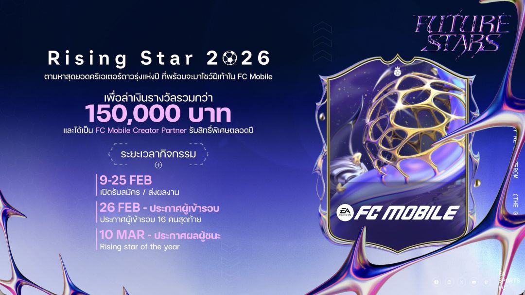 นอกจากนี้ EA SPORTS FC Mobile ยังได้สรุปภาพรวมกิจกรรมสำคัญตลอดปี 2025 พร้อมเผยทิศทางและวิสัยทัศน์ในปี 2026 ซึ่งมุ่งเน้นการพัฒนาเกมอย่างต่อเนื่อง การสร้างกิจกรรมที่เปิดโอกาสให้คอมมูนิตี้มีส่วนร่วมมากยิ่งขึ้น ซึ่งไฮไลต์สำคัญคือกิจกรรม Rising Star 2026 (Future Stars) กิจกรรมเฟ้นหาครีเอเตอร์ดาวรุ่งหน้าใหม่ที่พร้อมแจ้งเกิดและเติบโตไปกับคอมมูนิตี้ FC Mobile โดยผู้เข้าร่วมมีโอกาสลุ้นรับรางวัลรวมมูลค่ากว่า 150,000 บาท พร้อมโอกาสก้าวสู่การเป็น FC Mobile Creator Partner และรับสิทธิพิเศษตลอดทั้งปี ติดตามรายละเอียดกิจกรรมได้เร็วๆ นี้ทางหน้าเพจ EA SPORTS FC Mobile https://www.facebook.com/EASFCMobile