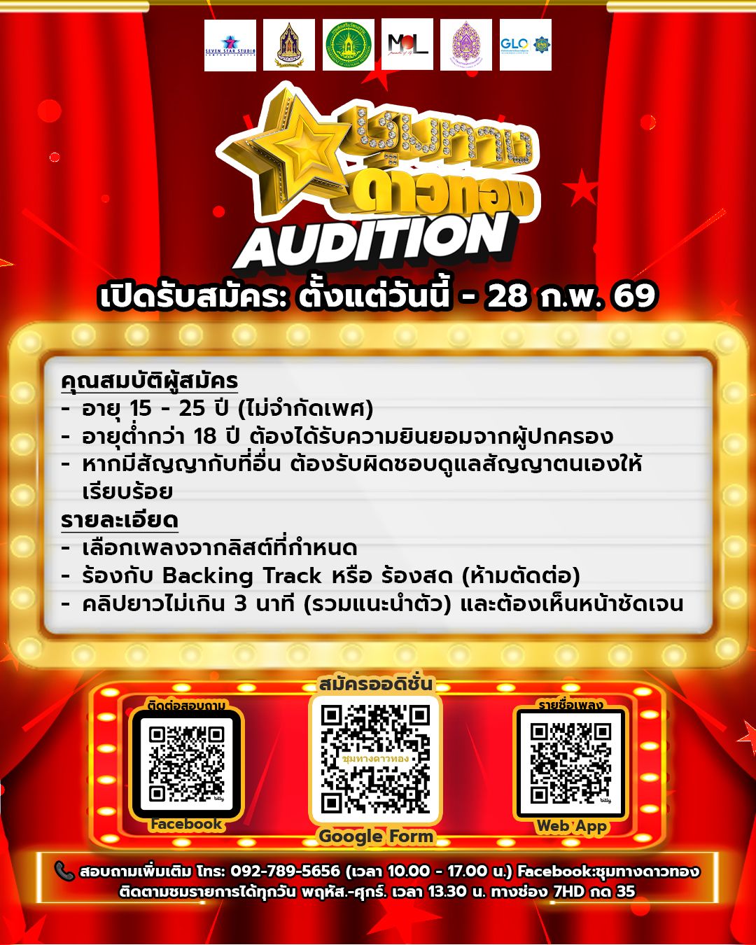 ส่วนใครที่เกาะติดและร่วมลุ้นกับการแข่งขัน GLO Miracle Music ซีซั่น 2 วันนี้เปิดศึกประชันไมค์คึกคักสุดสร้างสรรค์ ด้วยการเชิญชวนชาวไทยร่วมประทับใจกับบทเพลงพิเศษ เพื่อน้อมรำลึกในพระมหากรุณาธิคุณสมเด็จพระพันปีหลวง ขับร้องโดยตัวแทนเยาวชน จ.เพชรบุรี "โพสต์ พีรวิชญ์" และ "พิวเตอร์ พัชรพล" ตัวแทนเยาวชน จ.อุดรธานี ก่อนจะพลิกบทบาทเข้าสู่การแข่งขันสุดเข้มข้น เมื่อต้องดวลเพลงลูกทุ่งจังหวะโจ๊ะและเพลงช้ากินใจ ใครจะคว้าชัยในแมตช์นี้..รอลุ้นโปรฯความพิเศษยังไม่หมด! ซีซั่นนึ้ยังคงเข้มข้นส่วนซีซั่นใหม่ก็เปิดให้คนมีฝันมีไฟ อายุระหว่าง 15-25 ปี สามารถส่งคลิปมาออดิชั่นกันออนไลน์ โดยส่งมาได้ตั้งแต่วันนี้จนถึง 28 กุมภาพันธ์ 2569 พร้อมเช็ครายชื่อเพลงที่ใช้ประกวดได้ที่ https://docs.google.com/spreadsheets/d/1FQzG1jy9z3ZU8ocM81K7qRPnPMa8eGCA/edit?usp=sharing&ouid=117970526722556822050&rtpof=true&sd=true และสอบถามรายละเอียดเพิ่มเติมที่ โทร.092-789-5656เพลิดเพลินกับบทเพลงเพราะๆ และร่วมลุ้นไปพร้อมกันได้ในรายการ “ชุมทางดาวทอง” ทางช่อง 7HD กดหมายเลข 35 หรือชมผ่านออนไลน์ที่เพจเฟสบุ๊ค Ch7HD ออกอากาศวันพฤหัสบดีที่ 12 และศุกร์ที่ 13 กุมภาพันธ์ 2569 เวลา 13.30 น. เป็นต้นไป สามารถดูย้อนหลังได้ที่ www.bugaboo.tv, Youtube Channel 7 Star Studio และเฟสบุ๊คแฟนเพจhttps://www.facebook.com/chumtangdaotong/ ความบันเทิงที่ไปกับคุณทุกที่ทุกเวลา