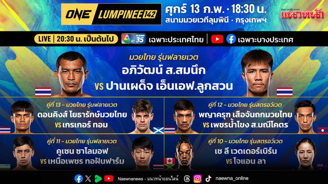 จัดหนัก หมัด เข่า ศอก อาวุธครบเครื่อง ช่อง 7HD ชวนลุ้นคู่มวยเดือดสุดสัปดาห์ โดย วันศุกร์ที่ 13 กุมภาพันธ์นี้ รายการ ONE ลุมพินี 142 ส่งคู่เอกประจำรายการ อภิวัฒน์ ส.สมนึก จอมบู๊ศอกคม จากหนองคาย ออกตามล่าแต้มชัย4 ไฟต์ติด ปะทะแกร่ง ปานเผด็จ เอ็นเอฟ.ลูกสวน รุ่นน้องฟอร์มสด จากเชียงใหม่ ที่ยังไม่แพ้ใครในรายการนี้ ส่วนคู่ไฮไลต์ สุริยันต์เล็ก พ.เย็นยิ่ง ที่ขอวัดกันแบบส่วนสูงไม่เกี่ยวใส่เดี่ยวได้หมด ท้าชนไอ้ก้านยาว โมฮาเหม็ด ตาวฟิก ดาวรุ่งจอมแกร่งจากโมร็อกโก ขณะที่อีกคู่เดือด เอลลิส บาร์โบซา นักสู้จากสหราชอาณาจักร ปะทะ จาง เป่ยเหมียน มวยบู๊จากจีน โดยจะดวลเก็บแต้มชัย ในกติกาคิกบ็อกซิ่ง รุ่นสตรอว์เวต ร่วมด้วยคู่มวยกติกาต่าง ๆ ให้แฟนกำปั้นได้รับชมความมันอย่างจุใจ