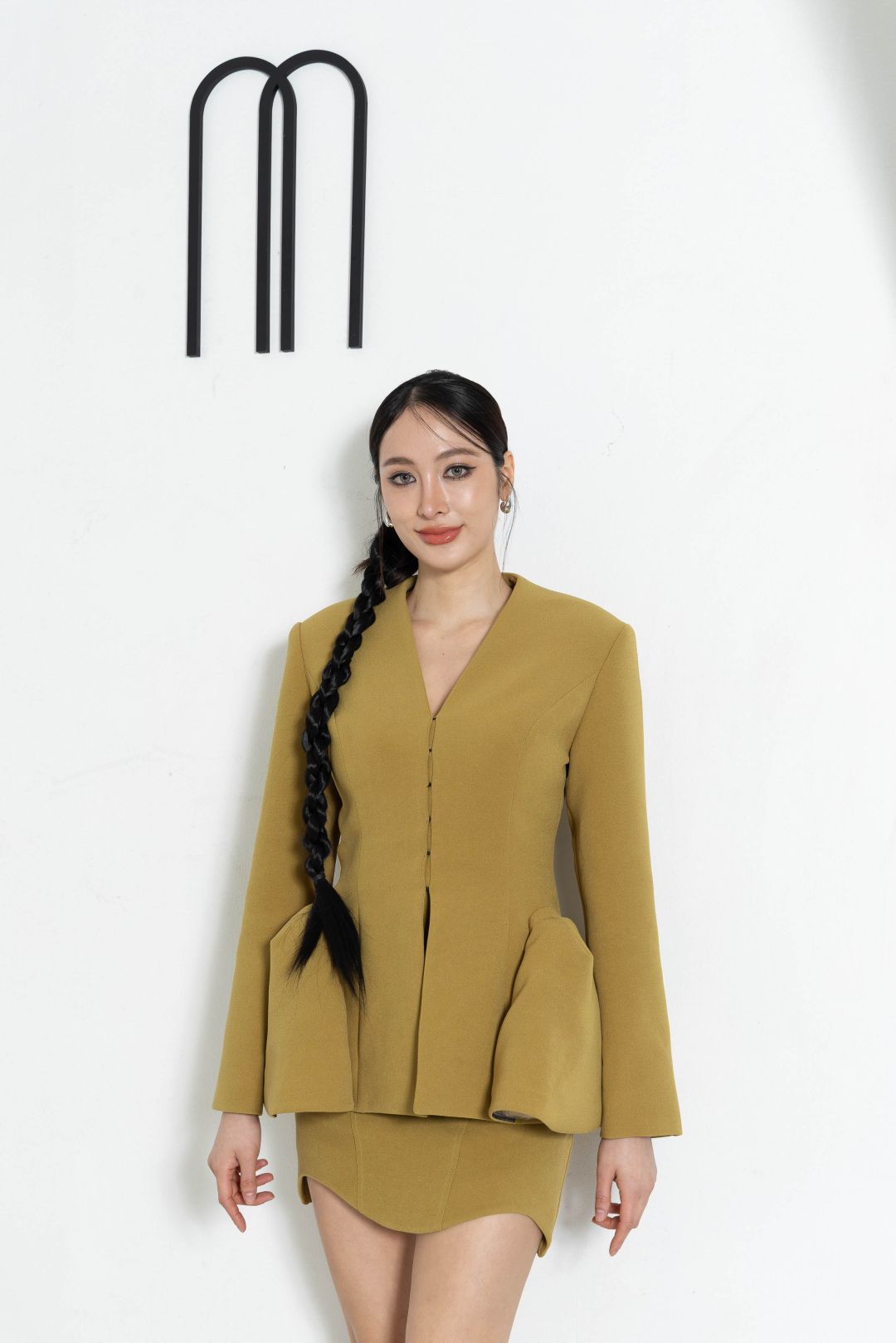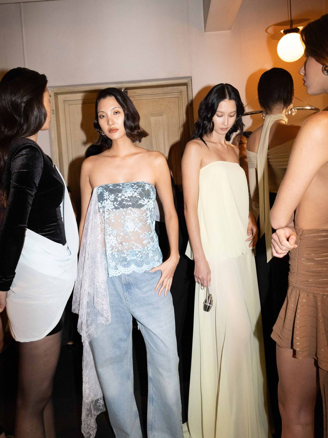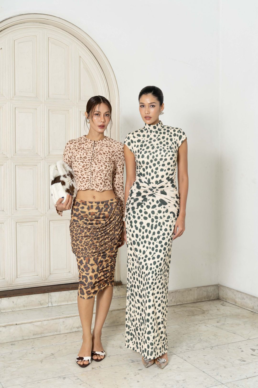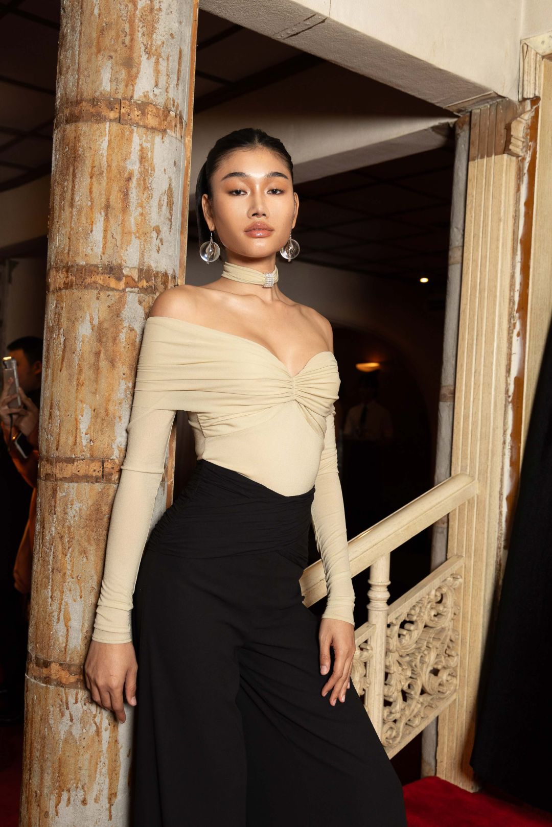 คอลเลกชั่นนี้ยังโดดเด่นด้วยการทดลองวางผ้าและการจับจีบในทิศทางใหม่ เพื่อสร้างมิติและความพลิ้วไหวให้กับเสื้อผ้า ผสานกับงานคัตติ้งอันประณีตที่ออกแบบมาเพื่อเสริมสรีระของผู้หญิงอย่างลงตัว ผ่านโครงสร้างเพพลัม (Peplum structures) ที่ช่วยขับเน้นช่วงเอวให้โค้งเว้าอย่างสง่างาม และสร้างสมดุลระหว่างความหรูหราและความน่าค้นหาได้อย่างกลมกลืน ผ่านการเลือกใช้แมททีเรียลที่คัดเลือกมากอย่างพิถีพิถัน ตั้งแต่ความนุ่มลึกของผ้ากำมะหยี่ ความเหลือบเงาของผ้าเมทัลลิก ไปจนถึงงานปักเลื่อมที่เคลื่อนไหวรับกับทุกจังหวะของเรือนร่าง ถ่ายทอดเสน่ห์ของเสื้อผ้าเมื่ออยู่บนร่างกายได้อย่างมีชีวิตชีวา ขณะเดียวกันยังนำเสนอพาเลตต์สีที่สะท้อนความมั่นใจและพลังของผู้หญิงร่วมสมัย เริ่มจากโทนสีสะอาดตาอย่างสีงาช้าง (Ivory) และสีครีม ก่อนตัดด้วยโทนสีหนักแน่นอย่างสีแดงก่ำ (Deep Red) และสีเขียวโอลีฟ (Olive Green) พร้อมเติมมิติด้วยโทนสีสดใหม่อย่างสีฟ้าอ่อน และสีม่วงลาเวนเดอร์เมทัลลิก เพื่อสร้างภาพรวมที่ร่วมสมัยและชัดเจนในตัวตน