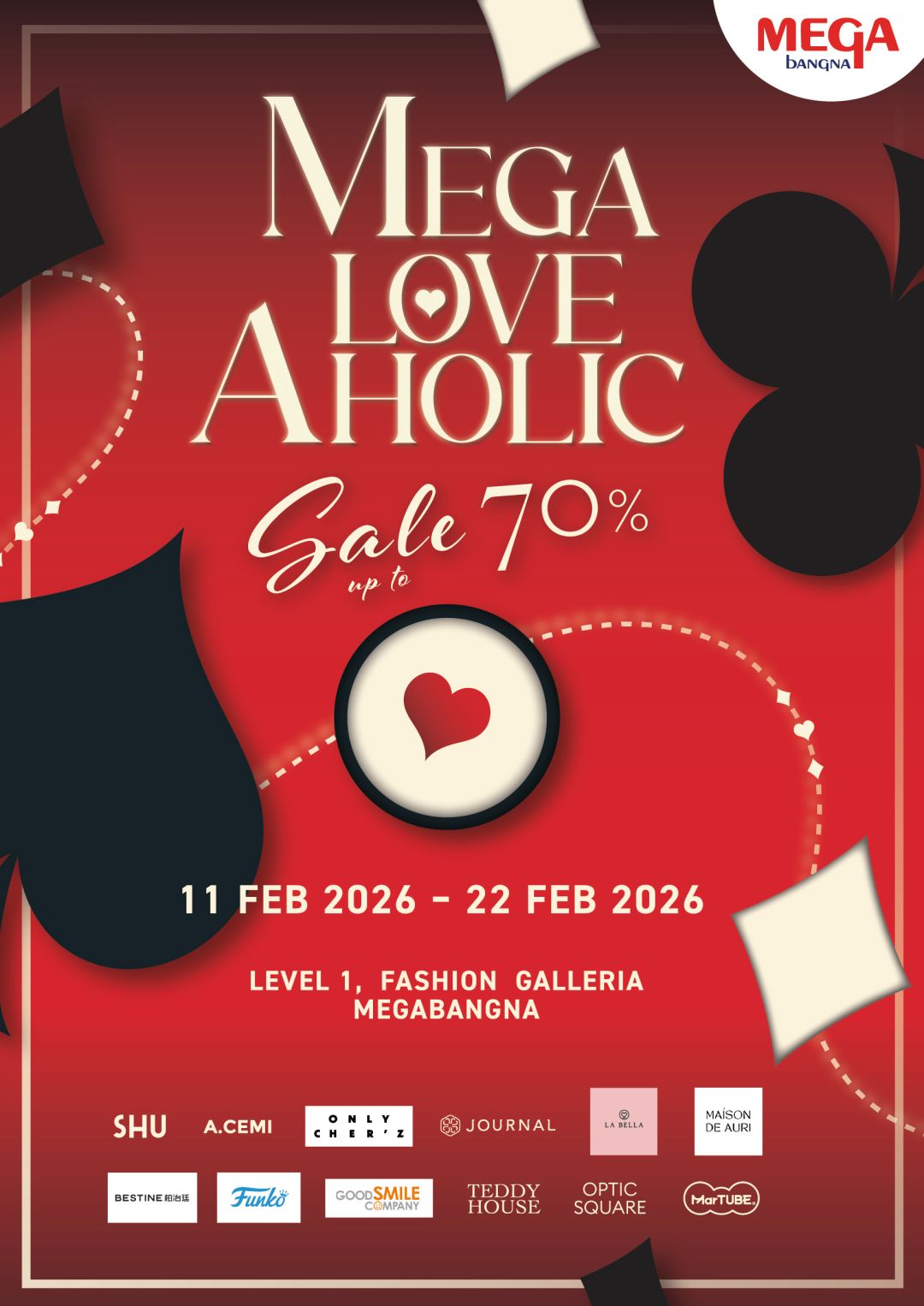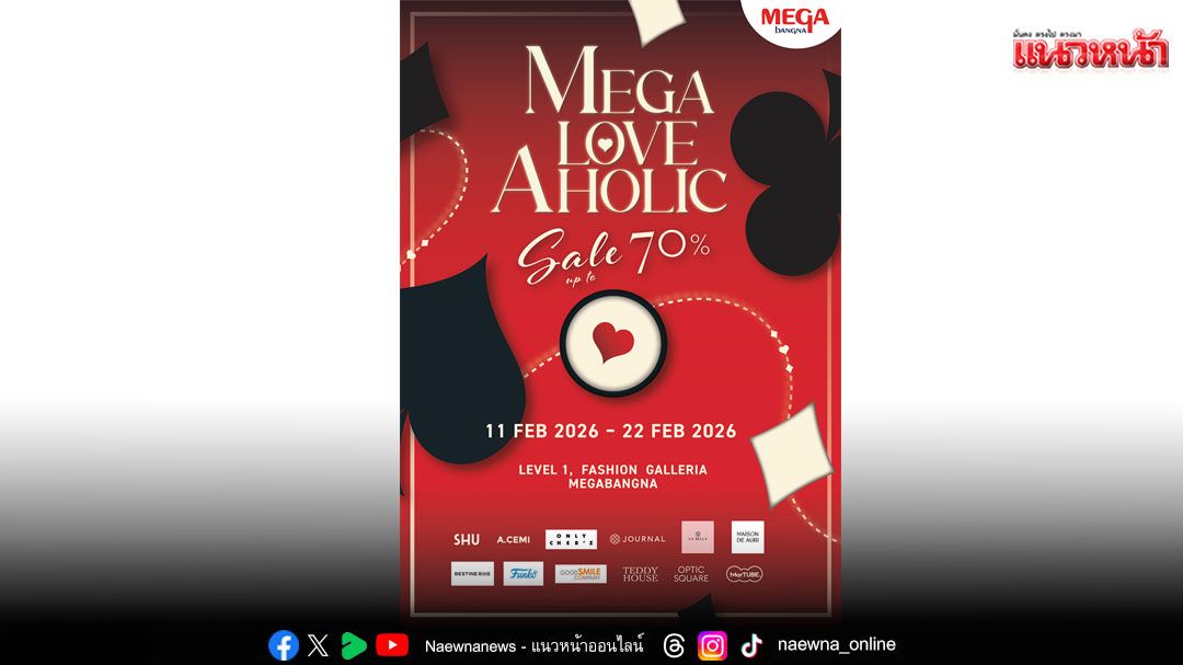 ร่วมฉลองเดือนแห่งความรักด้วยการมอบความสุขให้ตัวเอง และเลือกของขวัญแทนใจให้คนพิเศษ ในงาน “MEGA LOVE AHOLIC” งานช้อปปิ้งที่รวมแฟชั่นและไลฟ์สไตล์ไอเทมไว้ครบในที่เดียว พร้อมโปรโมชั่นพิเศษลดสูงสุด 70% ตั้งแต่วันที่ 11 – 22 กุมภาพันธ์ 2569 ณ โซนแฟชั่น แกลเลอเรีย ชั้น 1 ศูนย์การค้าเมกาบางนา