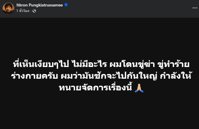 โดยจ๋ายระบุผ่านโซเชียลว่า “ที่เห็นเงียบๆ ไป ไม่มีอะไร ผมโดนขู่ฆ่า ขู่ทำร้ายร่างกายครับ ผมว่ามันชักจะไปกันใหญ่ กำลังให้ทนายจัดการเรื่องนี้”