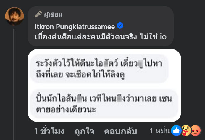 นอกจากนี้ เจ้าตัวยังเข้าไปชี้แจงเพิ่มเติมในคอมเมนต์ว่า “เบื้องต้นคือแต่ละคนมีตัวตนจริง ไม่ใช่ io” พร้อมเปิดเผยภาพข้อความแชตที่ถูกส่งมาข่มขู่ ว่า “ระวังตัวไว้ให้ดีนะไอXตว์ เดี๋ยวXไปหาถึงที่เลย จะเชือดไก่ให้ลิงดู ปั่นนักไอส้นXน เวทีไหนXงว่ามาเลย เซ็นตายอย่างเดียวนะ”