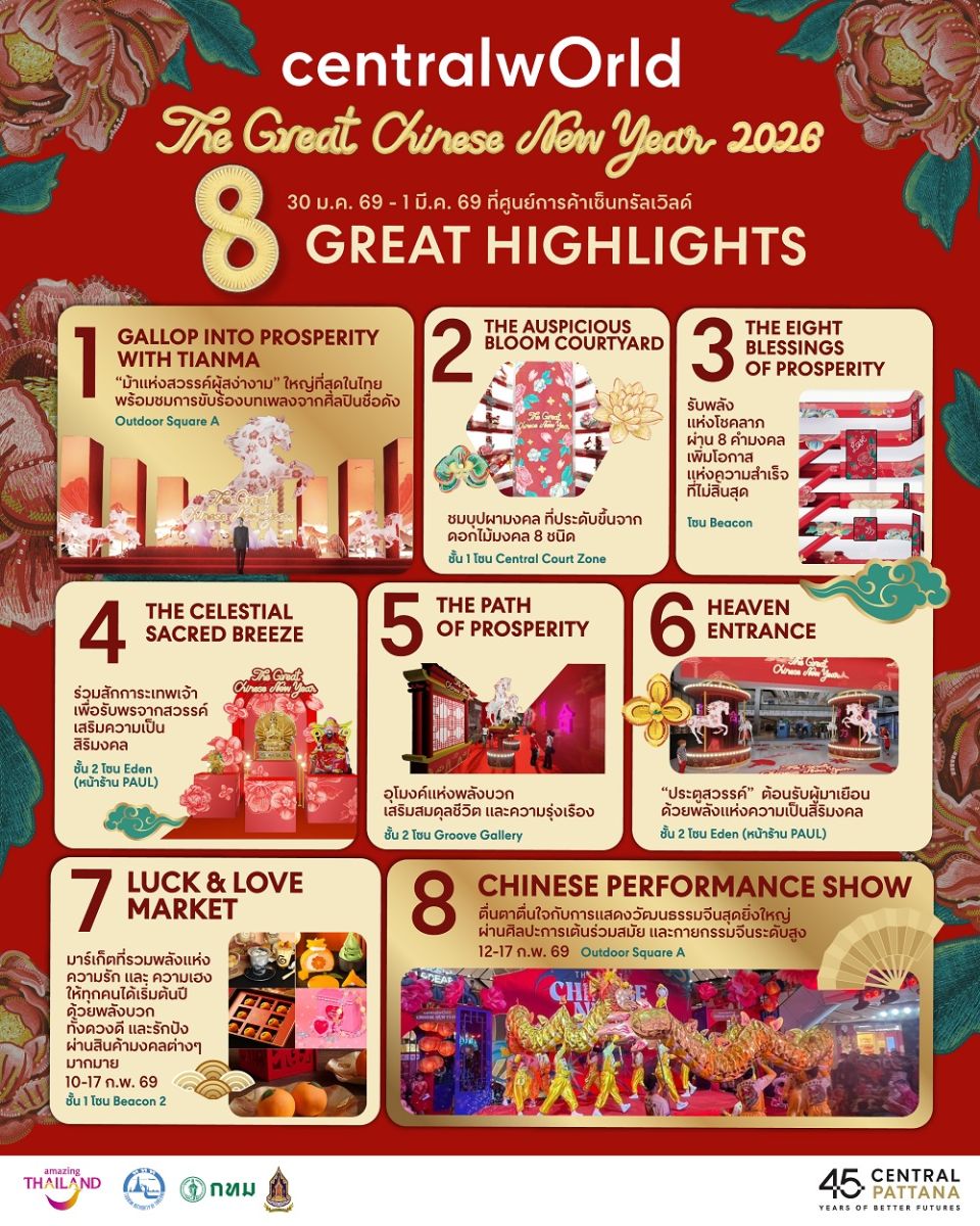 centralwOrld The Great Chinese New Year 2026’ เปิดฉากตรุษจีนปีมะเมียมหามงคลยิ่งใหญ่ระดับโลก ภายใต้คอนเซ็ปต์ ‘Gallop of Tian Ma – จังหวะแห่งชะตาฟ้า ม้าแห่งสวรรค์’ ชวนทุกคนรับพลังความเฮงใจกลางเมือง ผนึกกำลัง กรุงเทพมหานคร การท่องเที่ยวแห่งประเทศไทย (ททท.) กระทรวงวัฒนธรรม และพันธมิตรชั้นนำทั้งภาครัฐและเอกชน ย้ำแลนด์มาร์กฉลองตรุษจีนที่ดีที่สุด ครบทุกประสบการณ์ไลฟ์สไตล์ในที่เดียว ทั้งช้อป ไหว้ กิน เที่ยว มู ตอบโจทย์ทุกเจนฯ ชวนชาวไทยและนักท่องเที่ยว ให้มาอัปเกรดความปังตลอดเทศกาล เริ่มแล้ววันนี้ – 1 มี.ค. 69