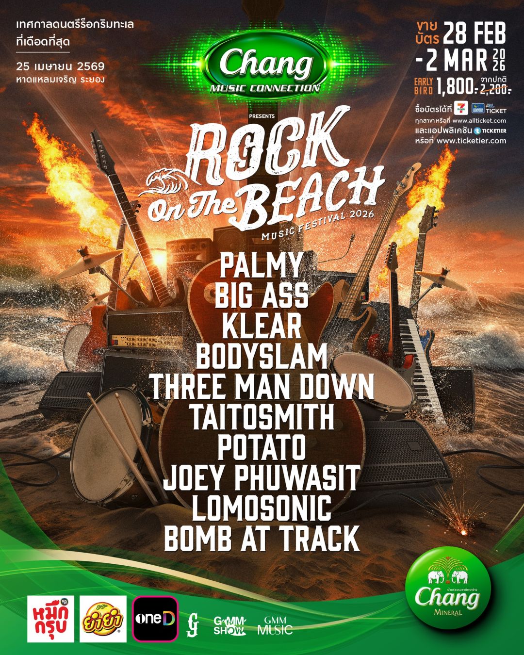 เตรียมเสื้อดำและรองเท้าผ้าใบให้พร้อม ออกเดินทางไปรับความร้อนแรงจากเสียงดนตรีในงาน “Chang Music Connection presents Rock On The Beach 2026” เทศกาลดนตรีร็อกริมทะเลที่ใหญ่ที่สุดและเดือดที่สุดในประเทศไทย เพราะผู้จัดมาตรฐาน GFest ผู้นำด้านการจัดคอนเสิร์ตและเฟสติวัลสุดพรีเมียม ภายใต้ “GMM SHOW” ไม่ได้มาเล่นๆ แต่มาเพื่อสร้างประสบการณ์สุดเดือด พร้อมเปลี่ยนหาดแหลมเจริญ จังหวัดระยอง ให้กลายเป็นสมรภูมิความมันของชาวร็อกทั่วประเทศ ในวันเสาร์ที่ 25 เมษายน 2569 โดยรวบรวมขุนพลร็อกระดับประเทศที่แค่เห็นไลน์อัป ก็รู้สึกถึงความมันอย่างต่อเนื่อง ตั้งแต่ Bodyslam, Big Ass, Potato, Palmy, Klear, Lomosonic และเสริมทัพด้วย Three Man Down, Taitosmith, Joey Phuwasit, Bomb at Track ที่พร้อมจะสะกดคนดูให้กระโดดพร้อมกันจนหาดสะเทือน ที่มาพร้อมโปรดักชันระดับประเทศ เวที แสง สี เสียง ถูกออกแบบมาเพื่อสร้างประสบการณ์ใหม่ๆ ที่ไม่ใช่แค่การมาฟังเพลง แต่เป็นการมาเสพศิลปะแห่งความเดือด ตะโกนร้องเพลงสุดเสียงท่ามกลางลมทะเลและเกลียวคลื่น บอกเลยว่ามีแต่ชาวร็อกเท่านั้นที่เข้าใจ!!!
