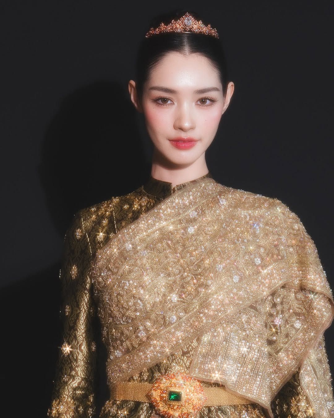 สำหรับลุคดังกล่าว มิ้นท์จัดเต็มความสง่างามตั้งแต่ศีรษะจรดปลายเท้า รวบผมเรียบตึงประดับมงกุฎเล็กสีทอง เข้าชุดกับต่างหูและเครื่องประดับโบราณที่มีดีเทลประณีต นอกจากความงดงามของเครื่องแต่งกายแล้ว ออร่าของเจ้าตัวยังเป็นอีกจุดที่หลายคนพูดถึง ไม่ว่าจะเป็นมุมหันข้าง มุมเงยหน้า หรือช็อตเดินกลางถนน แสงไฟยามค่ำคืนสะท้อนกับเนื้อผ้าจนเกิดประกายวิบวับ ส่งให้ชุดไทยดูอลังการและร่วมสมัยในเวลาเดียวกัน