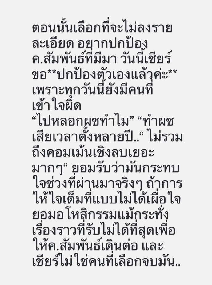 ตอนนั้นเลือกที่จะไม่ลงรายละเอียด อยากปกป้องความสัมพันธ์ที่มีมา วันนี้เชียร์ขอปกป้องตัวเองแล้วค่ะ เพราะทุกวันนี้ยังมีคนที่เข้าใจผิด "ไปหลอกผู้ชายทำไม" "ทำผู้ชายเสียเวลาตั้งหลายปี.." ไม่รวมถึงคอมเมนต์เชิงลบเยอะมาก ๆ