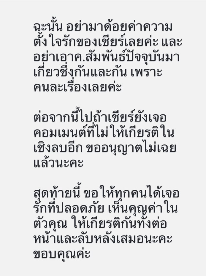 ต่อจากนี้ไปถ้าเชียร์ยังเจอคอมเมนต์ที่ไม่ให้เกียรติในเชิงลบอีก ขออนุญาตไม่เฉยแล้วนะคะ สุดท้ายนี้ ขอให้ทุกคนได้เจอรักที่ปลอดภัย เห็นคุณค่าในตัวคุณ ให้เกียรติกันทั้งต่อหน้าและลับหลังเสมอนะคะ ขอบคุณค่ะ"