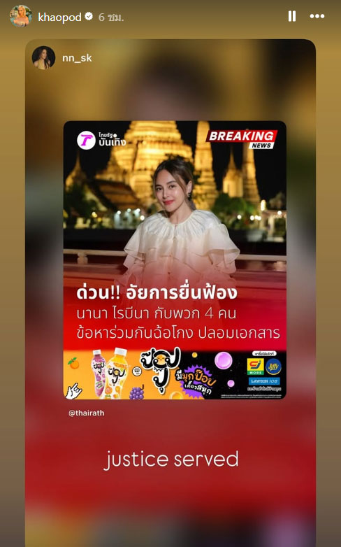 โดยหนึ่งในผู้เสียหายอย่างไฮโซสาว "ข้าวโพด สมิทธินันท์" ซึ่งก่อนหน้านี้ออกมาเปิดเผยว่าถูกตุ๋นเงินมูลค่ากว่า 70 ล้านบาท ได้เคลื่อนไหวทันทีผ่านสตอรี่ส่วนตัว ด้วยการแชร์ข่าวดังกล่าวพร้อมข้อความสั้นๆ ว่า “justice served” และ “คนละครึ่ง เบบี้”