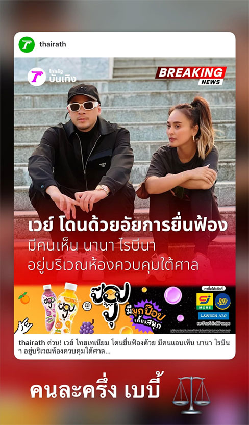 ข่าวที่เกี่ยวข้อง : เวย์-นานา รอดคุก ศาลให้ประกัน 1 ล้าน ห้ามออกนอกประเทศ