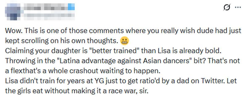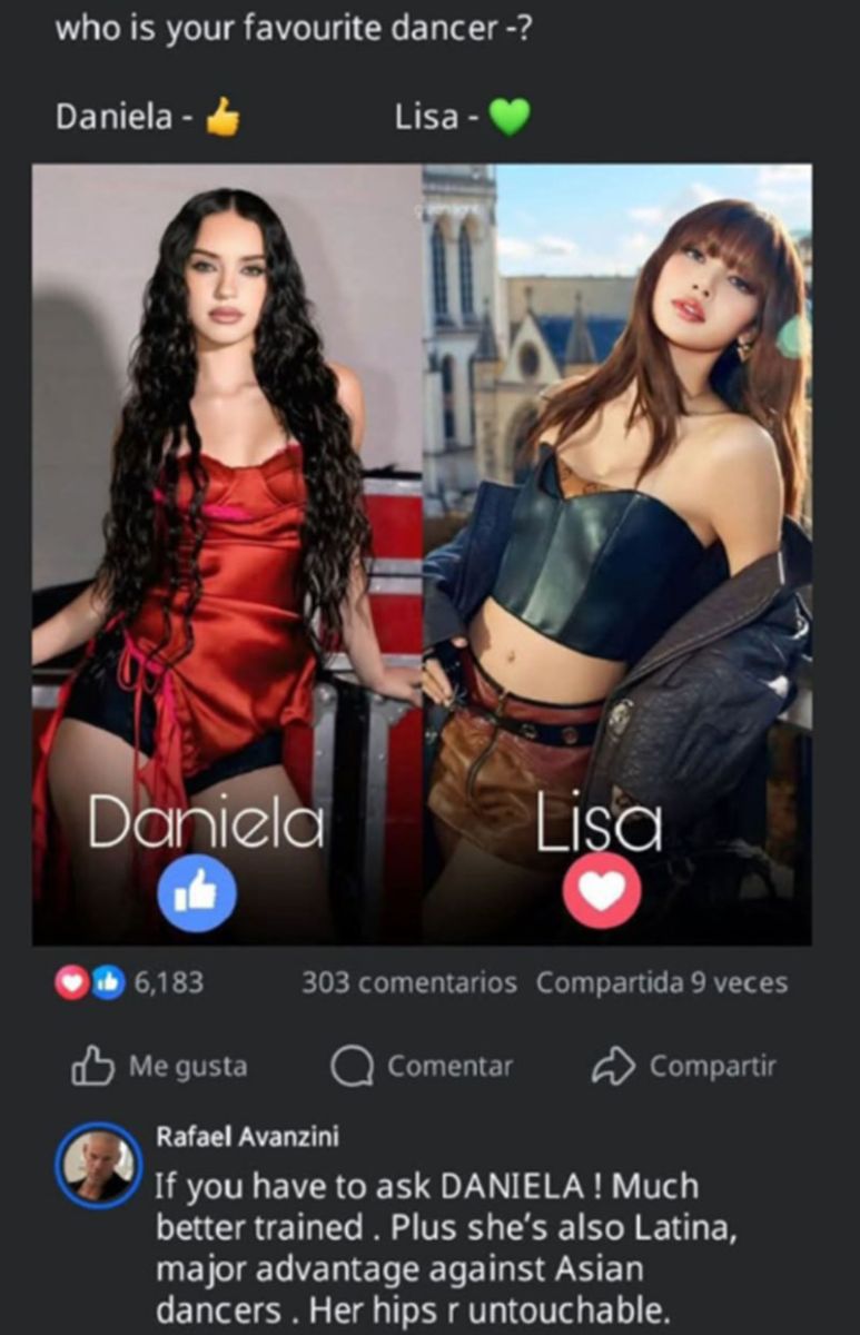 โดยการโหวตนักเต้นที่ชื่นชอบเป็นไปอย่างคึกคัก จนเมื่อคุณพ่อของ 'ดาเนียลา อวาซินี' ได้ออกมาคอมเมนต์ภายในโพสต์ดังกล่าวว่า "ลูกสาวของเขาได้รับการฝึกฝนมาดีกว่า ลิซ่า แบล็กพิงก์ มาก แถมเธอยังเป็นชาวลาตินาด้วย ซึ่งเป็นข้อได้เปรียบอย่างมากเมื่อเทียบกับนักเต้นชาวเอเชีย สะโพกของเธอไม่มีใครเทียบได้"