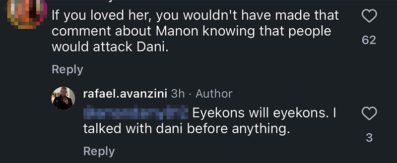 ทั้งนี้มีแฟนๆ ได้เข้าไปคอมเมนต์เตือนคุณพ่อของ 'ดาเนียลา อวาซินี' ว่า ถ้าคุณรักลูกจริง คุณคงไม่คอมเมนต์แบบนั้นทั้งๆ ที่รู้ว่าลูกสาวจะโดนโจมตี ซึ่งทางคุณพ่อได้ออกมาตอบโต้ว่า "เขาคุยกับลูกสาวก่อนทุกอย่างแล้ว"