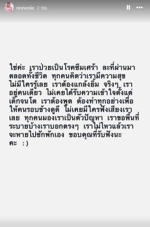 จากนั้นเธอได้โพสต์อีกข้อความยาว ระบุว่า "ใช่ค่ะ เราป่วยเป็นโรคซึมเศร้า ละที่ผ่านมาตลอดทั้งชีวิต ทุกคนคิดว่าเรามีความสุข ไม่มีใครรู้เลย เราต้องแกล้งยิ้ม