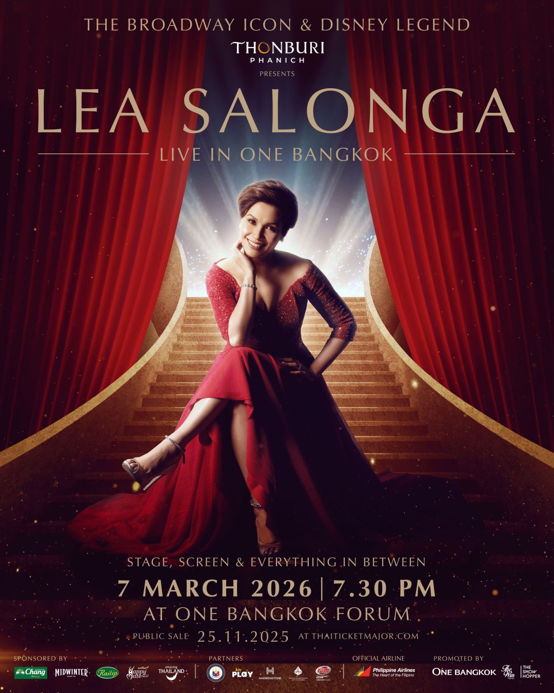 “Lea Salonga” ศิลปินหญิงผู้เป็นไอคอนแห่งวงการบรอดเวย์ และเจ้าของเสียงร้องระดับ Disney Legends ที่ตรึงใจผู้คนทั่วโลกและควรค่าแก่การฟังสดๆ สักครั้งในชีวิต เตรียมกลับมาสร้างความประทับใจให้แฟน ๆ ชาวไทยอีกครั้งในรอบ 15 ปี กับการแสดงเต็มรูปแบบใน Thonburi Phanich presents LEA SALONGA Live in One Bangkok การแสดงคอนเสิร์ตระดับโลก ในวันเสาร์ที่ 7 มีนาคม 2569 ณ One Bangkok Forum โดยขณะนี้ยอดจำหน่ายบัตรได้สร้างปรากฏการณ์ Sold Out ครบทุกที่นั่งเป็นที่เรียบร้อยแล้ว ภายในระยะเวลาเพียง 2 สัปดาห์เท่านั้น