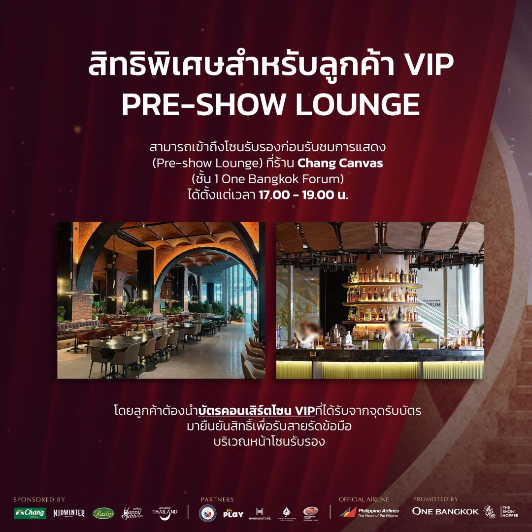 พิเศษ! สำหรับผู้ถือบัตร VIP 10,000 บาท สามารถเข้าถึงโซนรับรองก่อนรับชมการแสดง (Pre-Show Reception Lounge) ได้ที่ Chang Canvas บริเวณชั้น 1 One Bangkok Forum ได้ตั้งแต่เวลา 17:00 น.