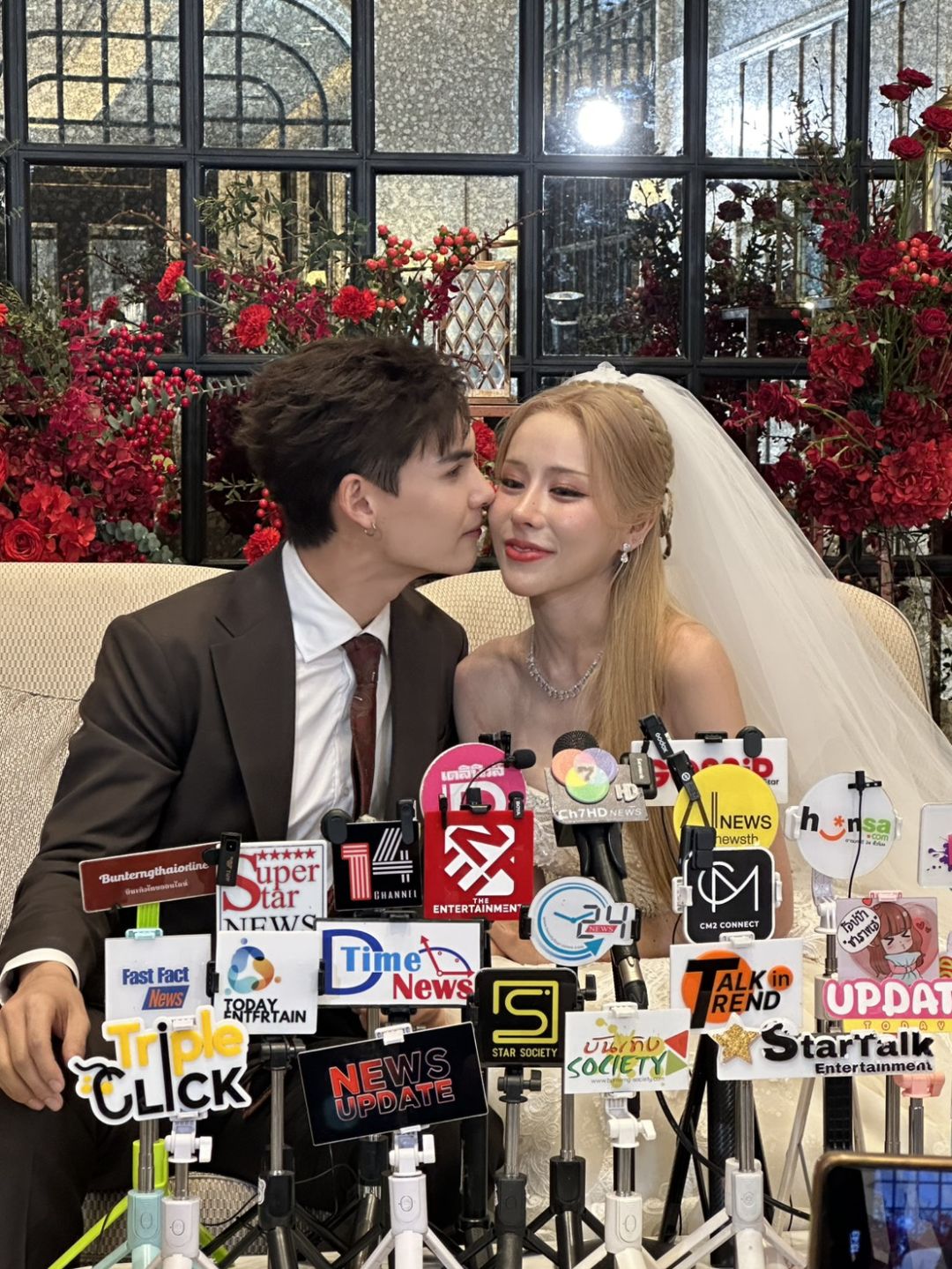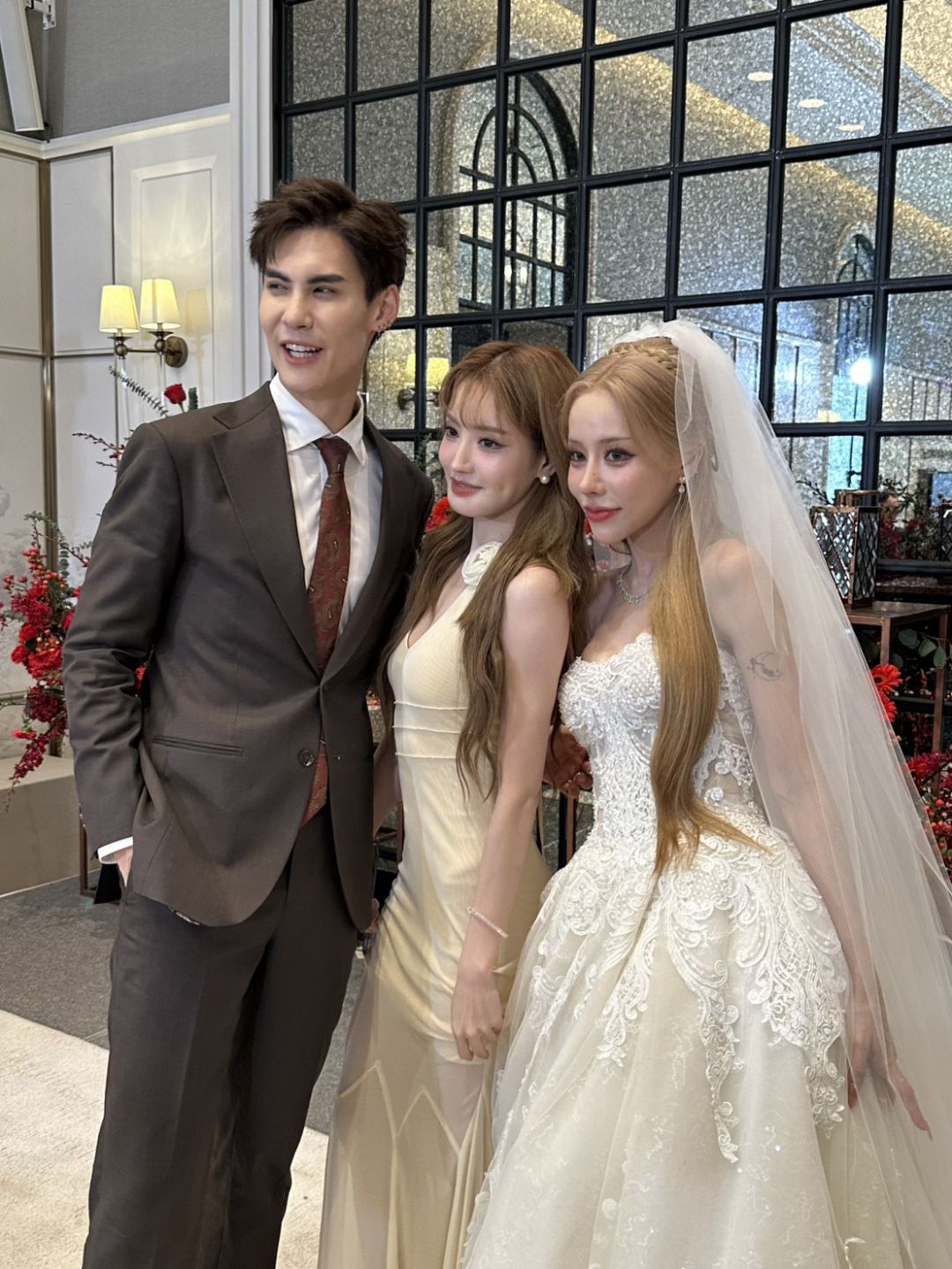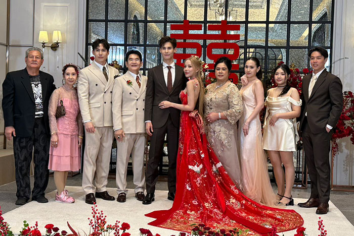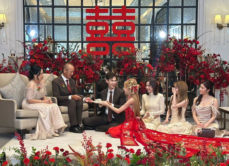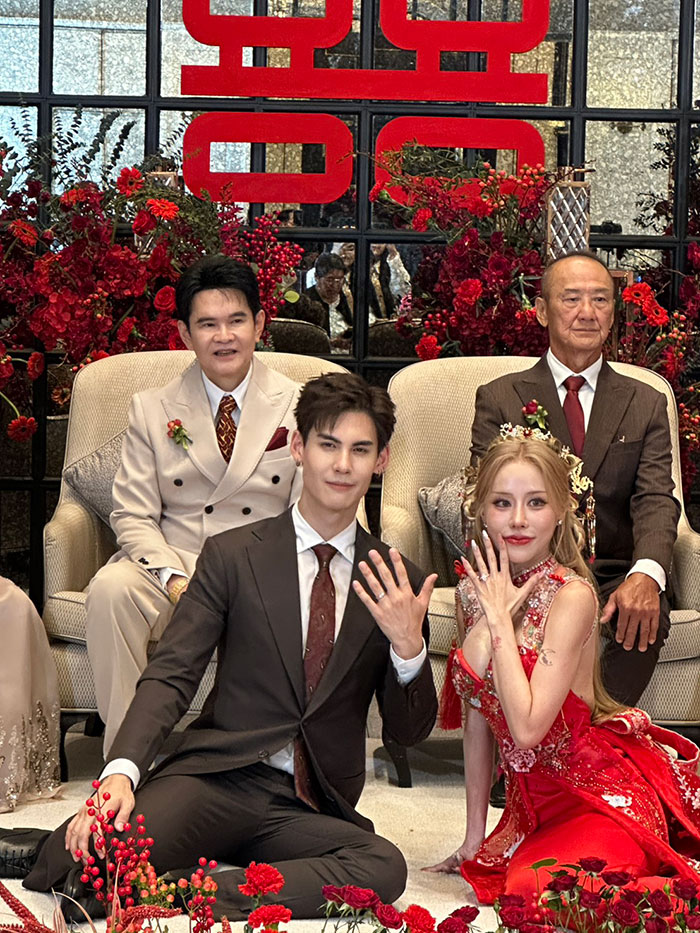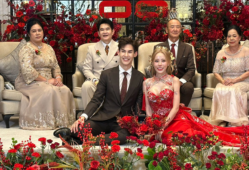 โดยบรรยากาศภายในงานตลบอบอวนไปด้วยความรักความอบอุ่น ของทั้ง 2 ครอบครัว มีการผสมผสานความเชื่อของทั้งสองครอบครัว โดยเริ่มจากพิธีแห่ขันหมากตามแบบไทย กับขบวนสิงโตที่นำมาเชิดสร้างสีสันความคึกคักภายในงาน และพิธียกน้ำชาตามขนบธรรมเนียมจีน โดยมีเพื่อนในวงการ อาทิ จันจิ จันจิรา ,แกรนด์ เดอะสตาร์ ,โอ๊ต รัฐธีร์ ,ทับทิม อัญรินทร์ ร่วมพิธีและแสดงความยินดี ณ โรงแรมอีสติน แกรนด์ พญาไท
