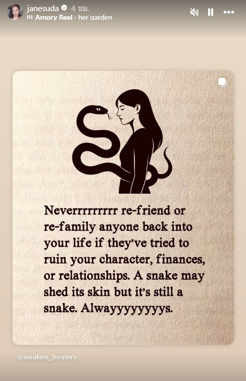1 มีนาคม 2569 ทำเอาโซเชียลสะดุ้งกันไม่น้อย เมื่อคุณแม่คนสวยและนักธุรกิจสาว "เจนสุดา ปานโต" ออกมาโพสต์ไอจีสตอรี่ข้อความสุดแซ่บ โดยเป็นภาพผู้หญิงคู่กับงู พร้อมข้อความภาษาอังกฤษว่า “Neverrrrrrrr re-friend or re-family anyone back into your life if they’ve tried to ruin your character, finances, or relationships. A snake may shed its skin but it’s still a snake. Always.”