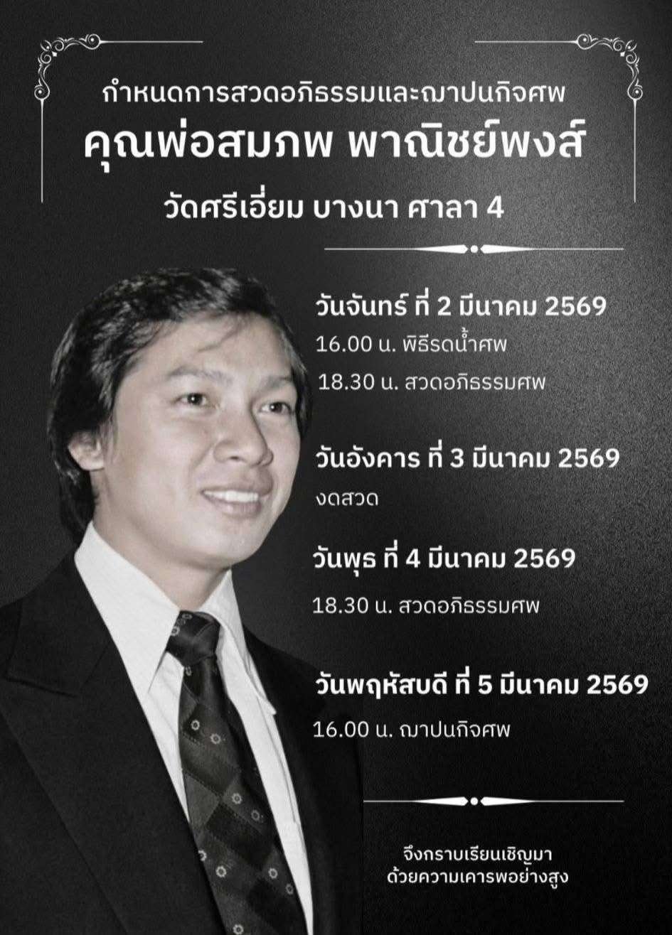 นักแสดงและอดีตนักร้องชื่อดังยุค 90 วง Bazoo "กำปั้น กวินพนธ์ พาณิชย์พงส์" โพสต์ข่าวเศร้าการจากไปของคุณพ่อโดยระบุว่า "RIP พ่อครับ เจอแม่บนสวรรค์ฝากบอกแม่ด้วยลูกคิดถึงนะครับ พักผ่อนอย่างสงบไม่เจ็บไม่ปวดแล้วนะครับพ่อ" โดยมีกำหนดสวดอภิธรรมวันที่ 2 มีนาคมนี้ ณ วัดศรีเอี่ยม บางนา ศาลา4
