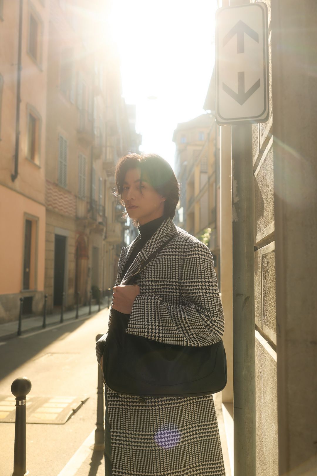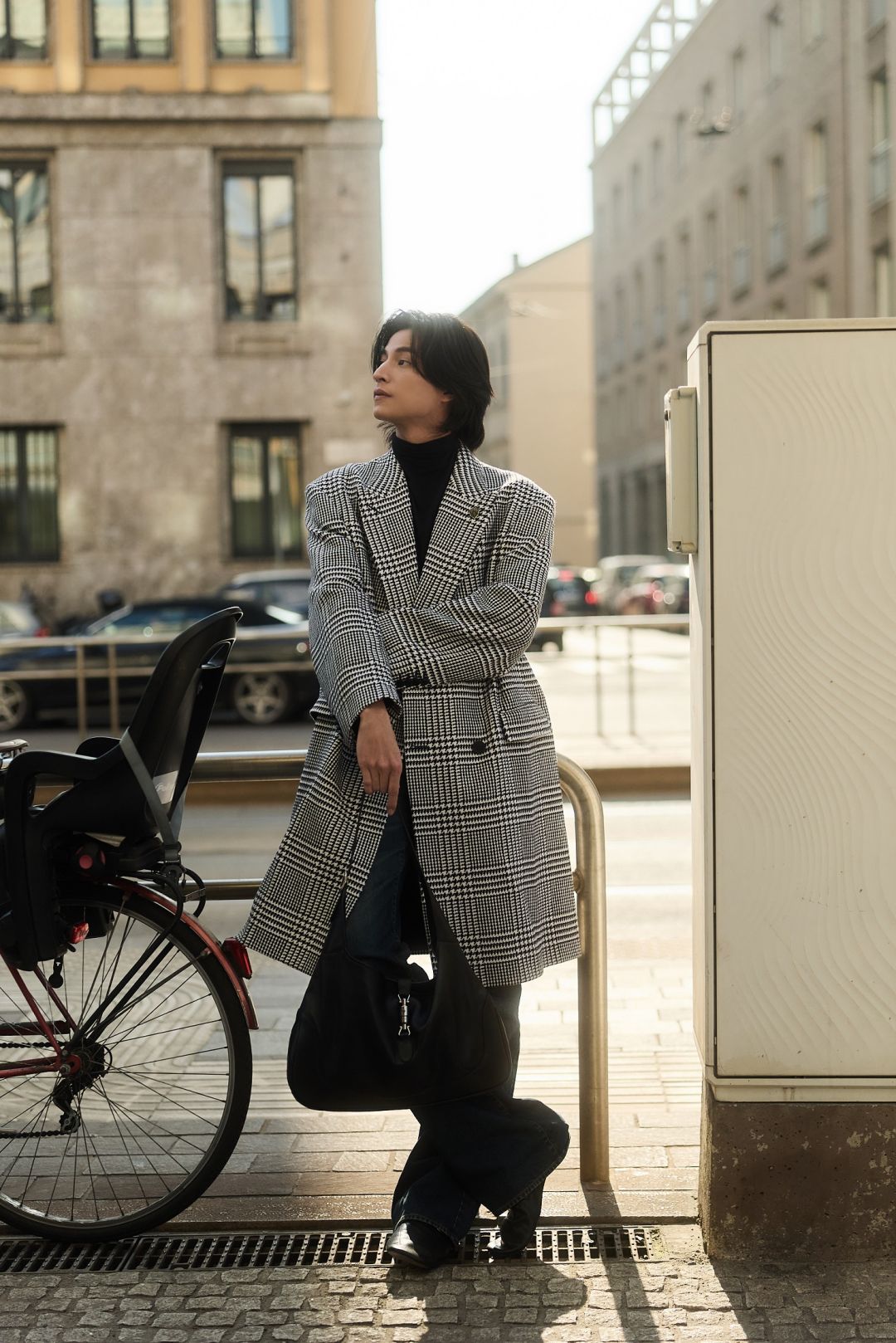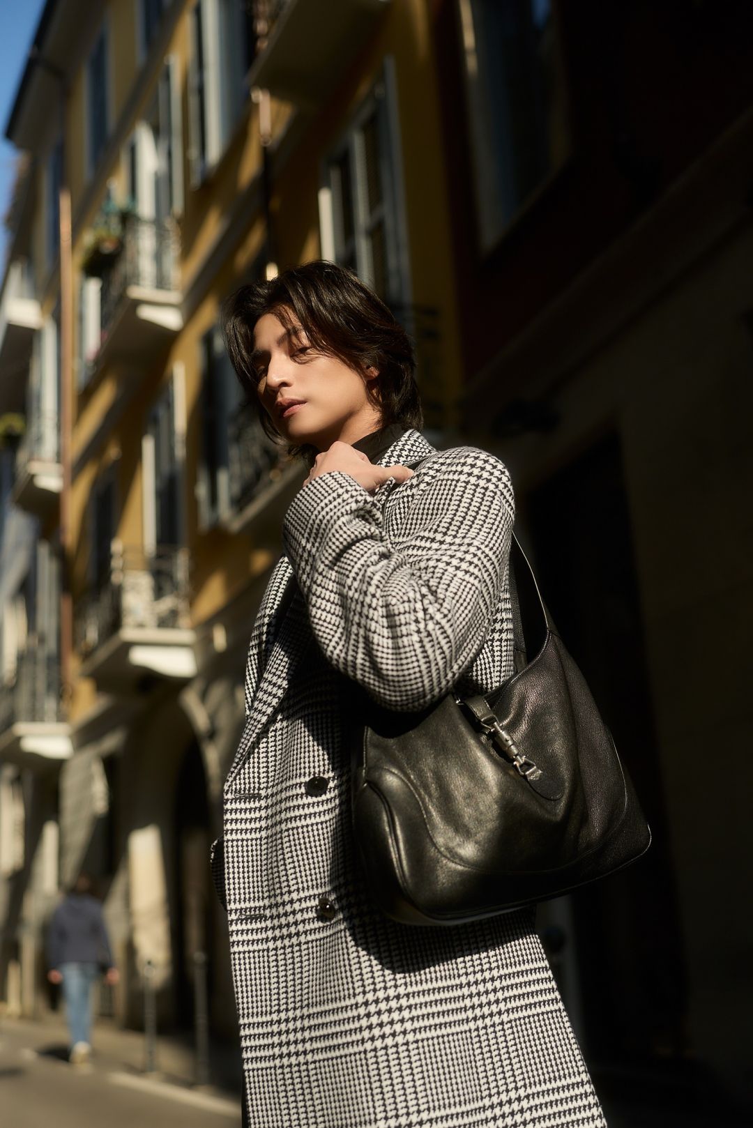 “กลัฟ - คณาวุฒิ” ถ่ายทอดเสน่ห์สุดอบอุ่นในแบบฉบับหนุ่ม Gucci ท่ามกลางไวบ์แสงแดดละมุนของมิลาน ผ่านลุค Cocco di Mamma จากคอลเล็กชั่น La Famiglia ด้วยเสื้อแขนยาวคอเต่าสีดำ จับคู่กางเกงผ้าฝ้ายเดนิมฟอกสีตกแต่งด้วยสัญลักษณ์ Horsebit พร้อมด้วยเสื้อโค้ทผ้าวูลลาย Prince of Wales สีขาว–ดำ ประดับด้วยเข็มกลัด Gucci Crest คอมพลีทลุคด้วยกระเป๋า รุ่น Jackie 1961 และรองเท้า Horsebit Loafer หนังสีดำ