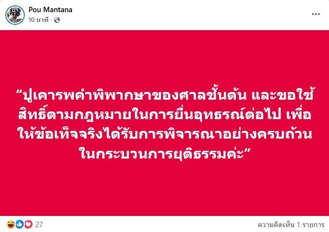 และโพสต์ล่าสุด “ปูเคารพคำพิพากษาของศาลชั้นต้น และขอใช้สิทธิ์ตามกฎหมายในการยื่นอุทธรณ์ต่อไป เพื่อให้ข้อเท็จจริงได้รับการพิจารณาอย่างครบถ้วนในกระบวนการยุติธรรมค่ะ”