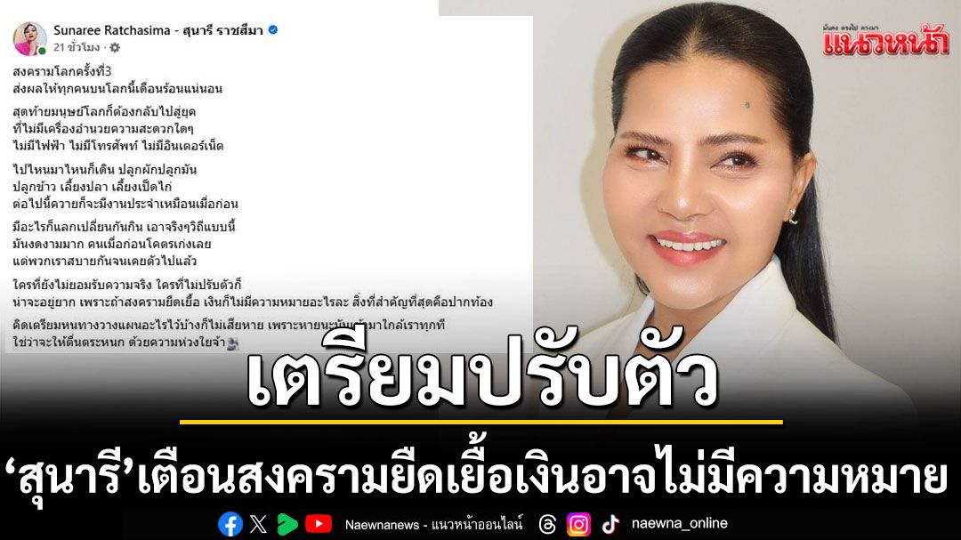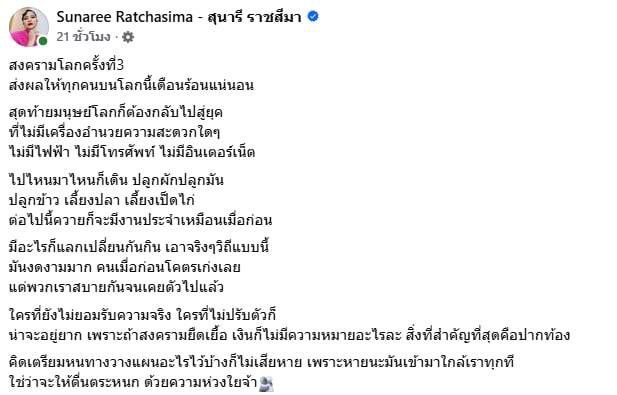 ท่ามกลางสถานการณ์ความขัดแย้งที่เกิดสงครามขึ้นขณะนี้ส่งผลกระทบต่อผู้คนและเศรษฐกิจโลกเป็นอย่างมาก ทำให้ค่าใช้จ่ายในชีวิตประจำวันพุ่งสูงขึ้น จนหลายฝ่ายเริ่มกังวลอนาคต ล่าสุดน้กร้องลูกทุ่งในตำนาน สุนารี ราชสีมา ได้ออกมาเคลื่อนไหวผ่านเฟสบุ๊คส่วนตัวโดยระบุข้อความว่า