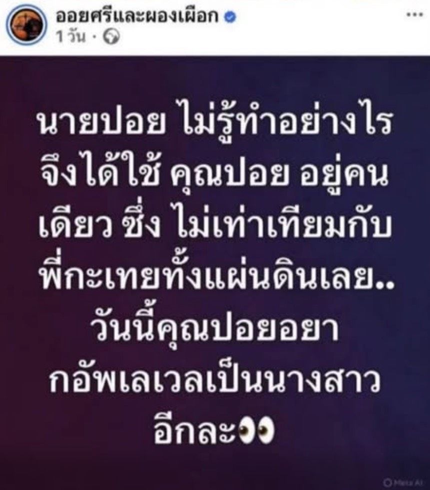 และต่อด้วยข้อความ นายปอยไม่รู้ทำอย่างไรจึงได้ใช้ คุณปอย อยู่คนเดียว ซึ่งไม่เท่าเทียมกับพี่กะเทยทั้งแผ่นดินเลย..วันนี้คุณปอยอยากอัพเลเวลเป็นนางสาวอีกละ
