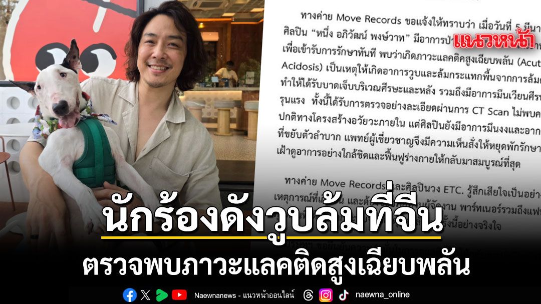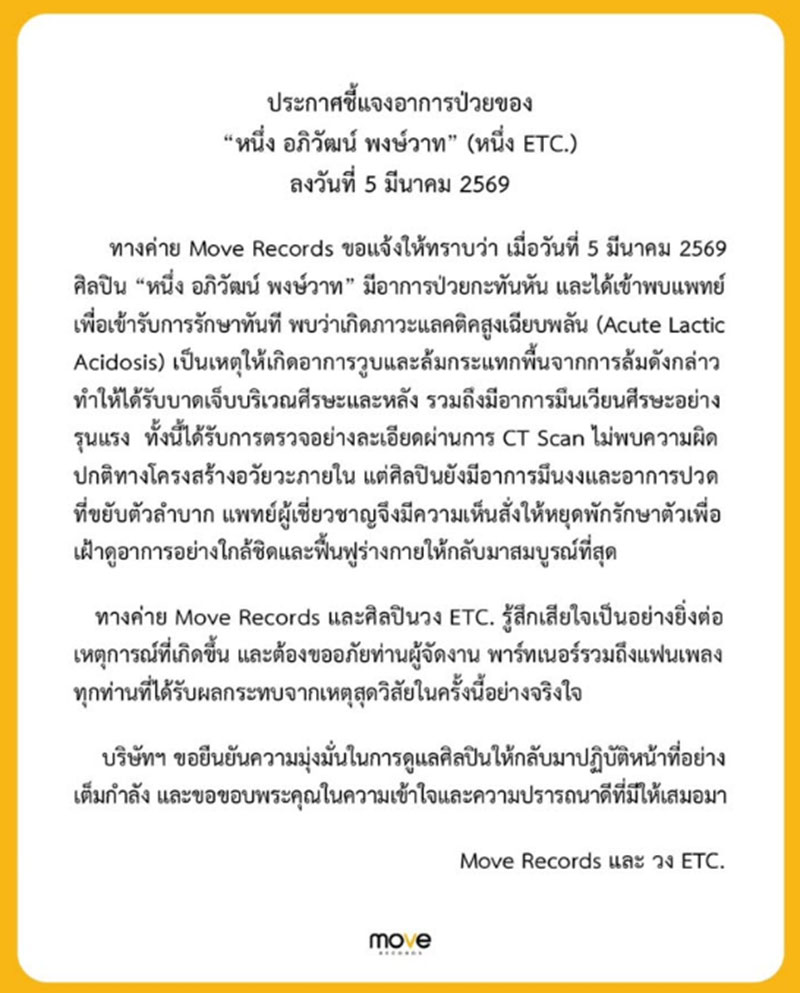 ล่าสุดทางต้นสังกัดอย่างค่าย Move Records ได้ออกมาร่อนแถลงอาการป่วยของ หนึ่ง ETC. ระบุข้อความ ทางค่าย Move Records ขอแจ้งให้ทราบว่า เมื่อวันที่ 5 มีนาคม 2569 ศิลปิน “หนึ่ง อภิวัฒน์ พงษ์วาท” มีอาการป่วยกะทันหัน และได้เข้าพบแพทย์ เพื่อเข้ารับการรักษาทันที พบว่าเกิดภาวะแลคติดสูงเฉียบพลัน (Acute Lactic Acidosis) เป็นเหตุให้เกิดอาการวูบและล้มกระแทกพื้น