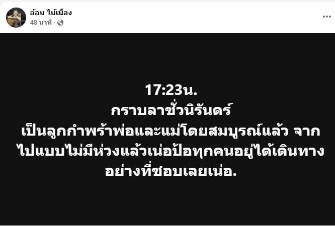 เมื่อวันที่ 8 มี.ค.2569 เพจเฟซบุ๊ก "อ้อม ไม้เมือง" ซึ่งเป็นศิลปินเพลงกำเมือง และเพลงเพื่อชีวิตชื่อดัง ได้โพสต์แจ้งข่าวเศร้าสูญเสียคุณพ่อ โดยระบุว่า "17:23น. กราบลาชั่วนิรันดร์ เป็นลูกกำพร้าพ่อและแม่โดยสมบูรณ์แล้ว จากไปแบบไม่มีห่วงแล้วเน่อป้อทุกคนอยู่ได้เดินทางอย่างที่ชอบเลยเน่อ."