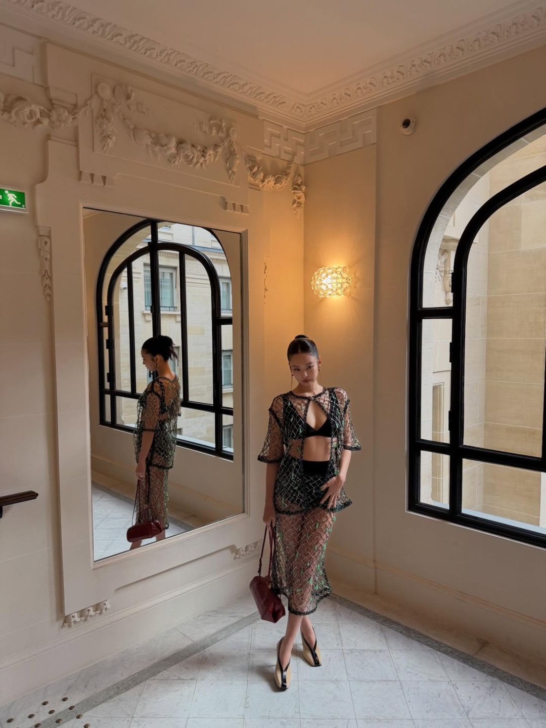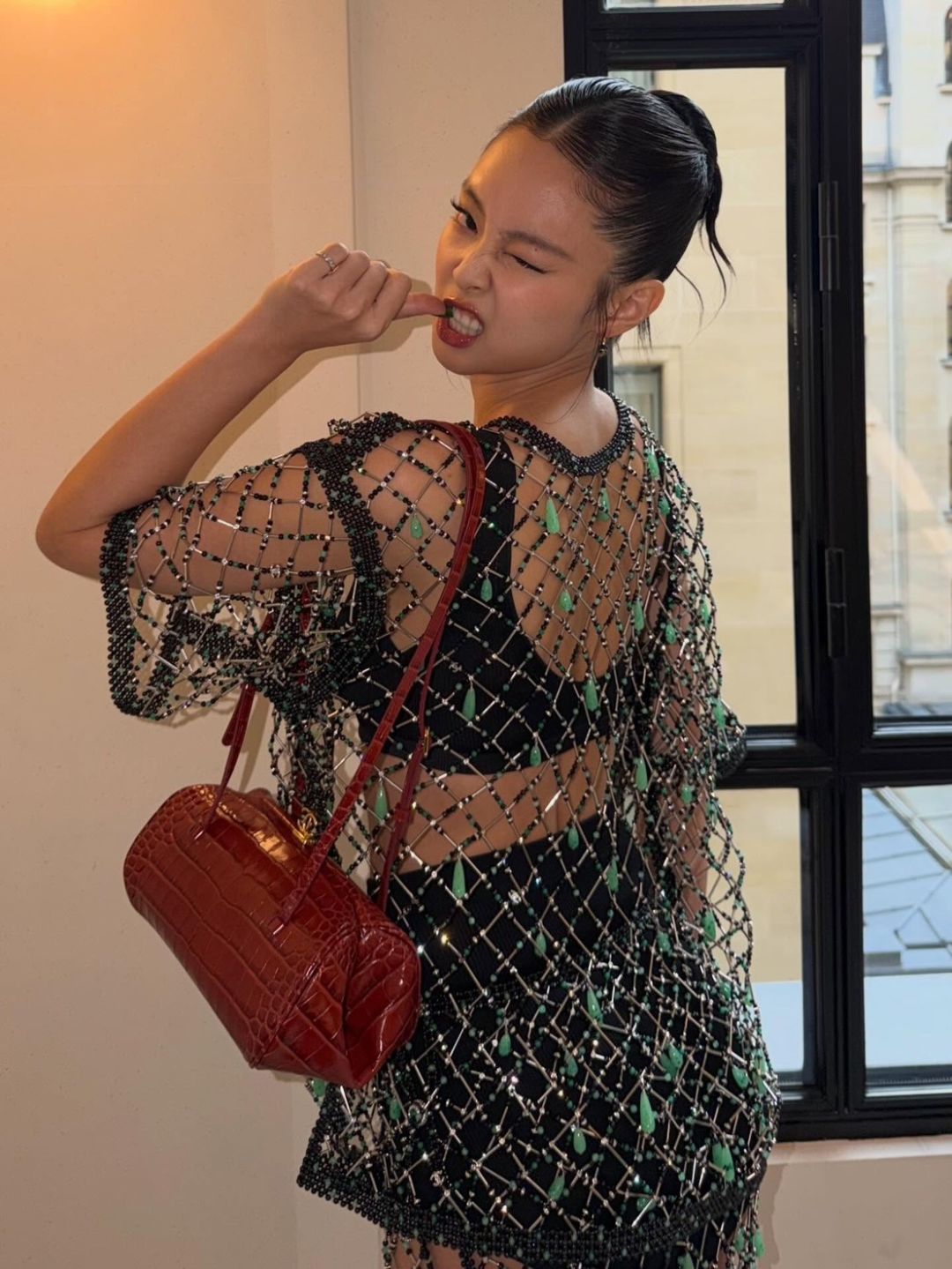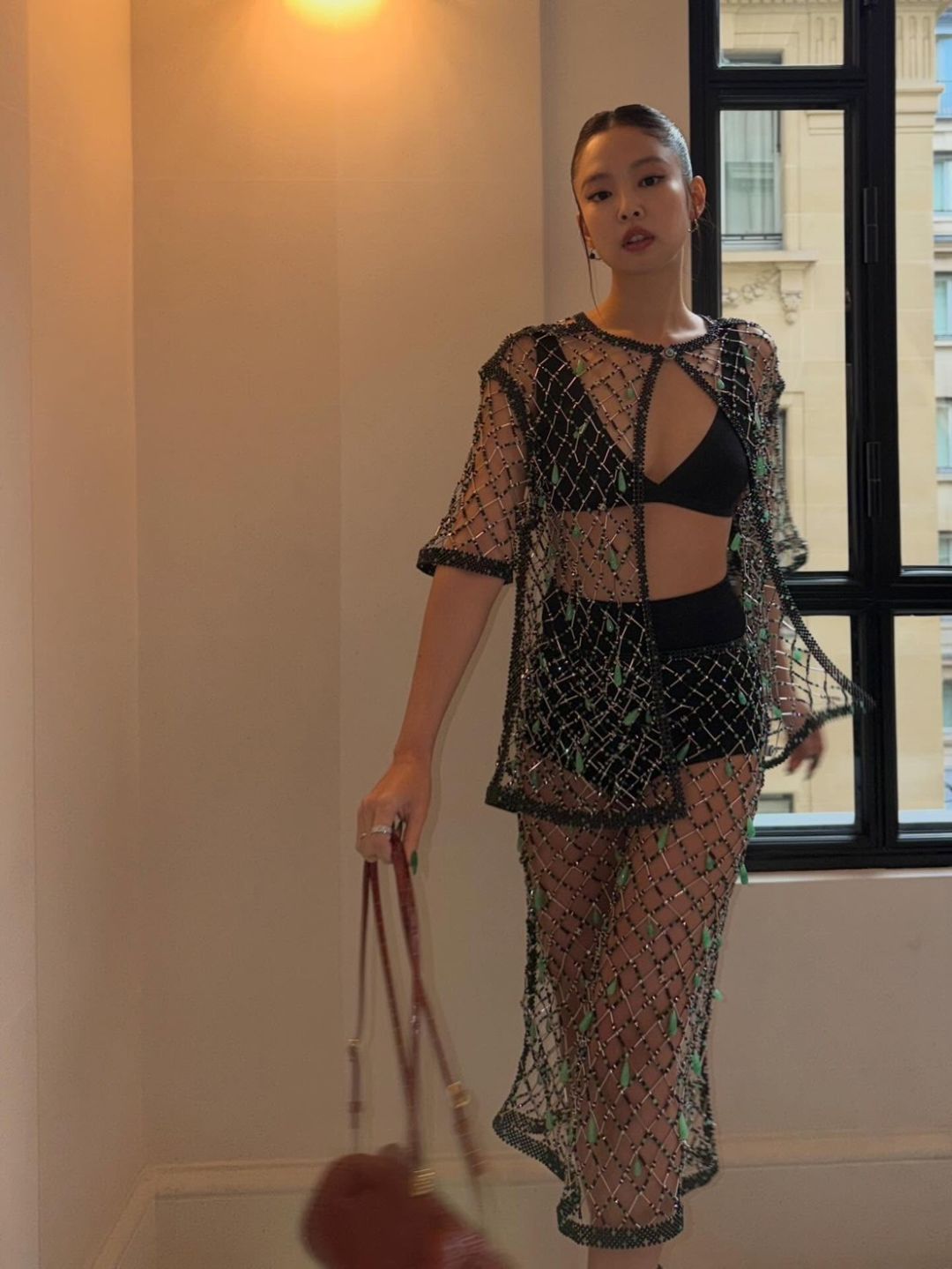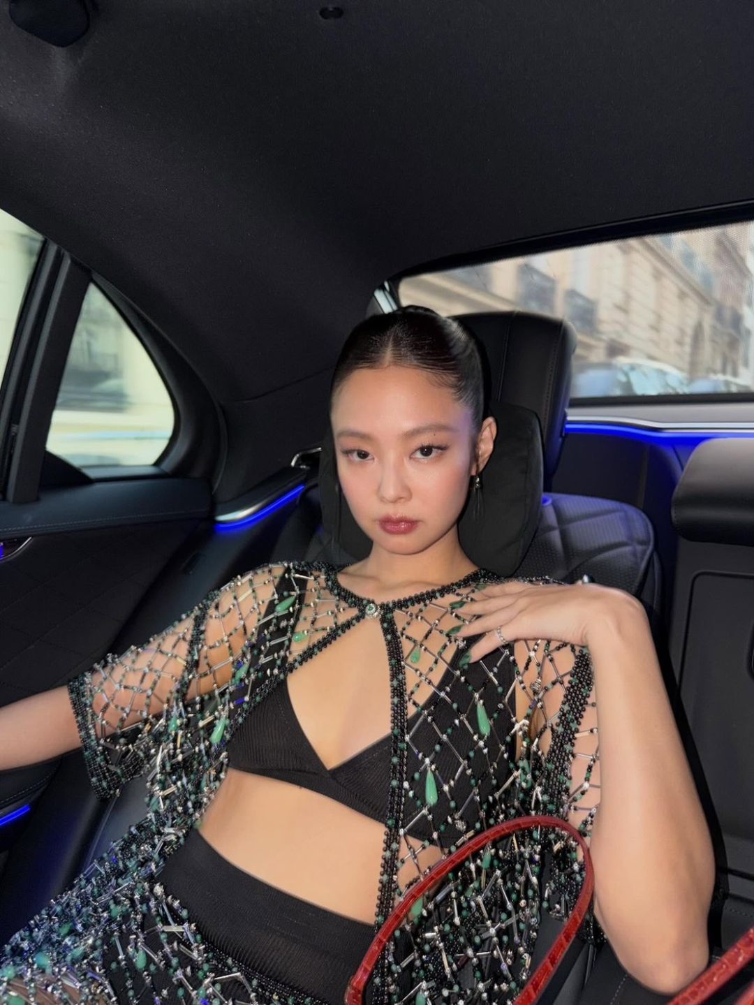 สำหรับลุคในงานครั้งนี้ เจนนี่มาในสไตล์สุดโดดเด่น สวมบราท็อปสีดำแมตช์กับชุดซีทรูตาข่ายประดับคริสตัลที่ช่วยเพิ่มความระยิบระยับ เผยความเซ็กซี่อย่างมีระดับ ก่อนคอมพลีตลุคด้วยโค้ทหนังสีแดงยาวและกระเป๋าถือสีแดง เพิ่มความเท่และความหรูในเวลาเดียวกัน