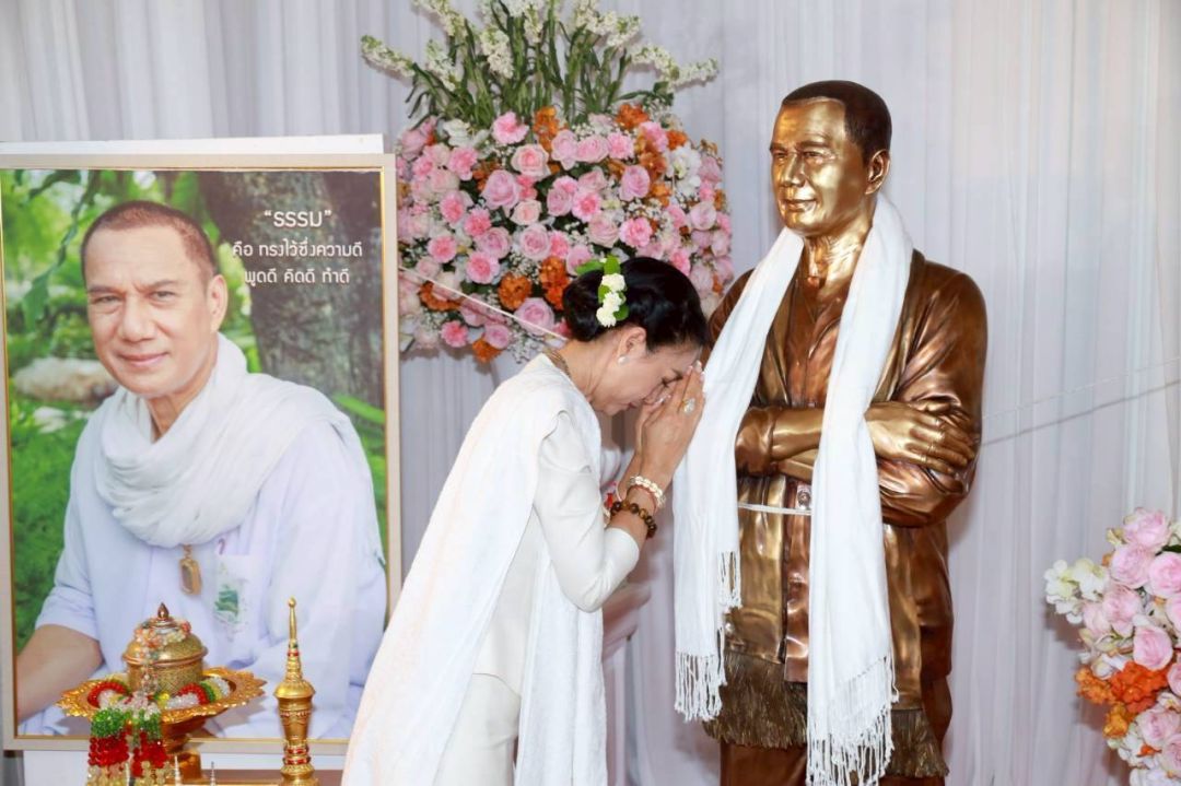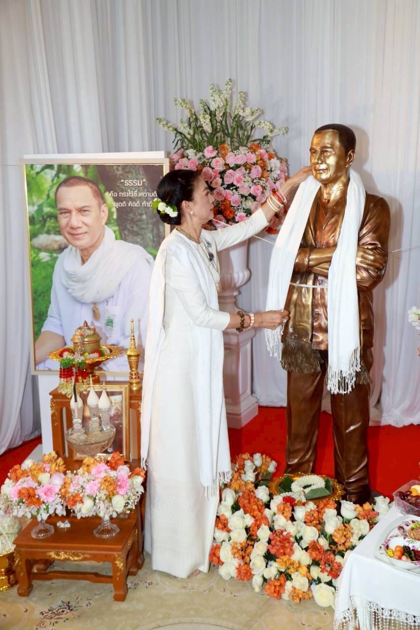 “วันนี้พระมาเยอะมากทั้งนิมนต์และไม่ได้นิมนต์ เป็นที่อัศจรรย์มาก และปีนี้พิเศษสุดคือนำรูปปั้นกลับบ้าน ซึ่งมาถึงเมี่อวันที่ 9 มี.ค. ก็มีพิธีสวดพุทธมนต์ต้อนรับ รูปปั้นเพิ่งทำเมื่อปลายปีที่แล้ว เพราะเมื่อ 4 ปีที่ผ่านมาจิตใจพวกเรายังไม่เข้มแข็ง พอทุกอย่างดีขึ้นก็ค่อยๆ เดินตามสเต็ปที่เคยคุยกับพี่เอกไว้ ปีที่แล้วเลยติดต่อช่างว่าจะปั้นรูปพี่เอก ใช้เวลาเป็นปีกว่าจะปั้นเสร็จ เรานำรูปปั้นมาที่นี่เพราะเป็นบ้านที่พี่เอกเลือก สถานที่นี้เป็นสถานที่ๆ เค้าใช้ในการสร้างบุญบารมี สร้างสถาปัตยกรรมของแผ่นดินให้คนไทยทั้งชาติ พี่เอกจะอยู่ตรงนี้ให้แฟนๆ ได้เห็นกันตรงจุดต้อนรับประชาชน ตอนไปรับก็บอกพี่เอกว่ากลับบ้านนะ สำหรับชุดที่เลือกให้ปั้นจะเหมือนกับที่พี่เอกใส่ เสื้อสีขาวมีผ้าคล้องคอ เรารู้สึกว่ารูปปั้นเหมือนเป็นตัวแทนจิตวิญญาณของเค้า เป็นเหมือนตัวจริงที่ทุกคนมาสัมผัสได้”