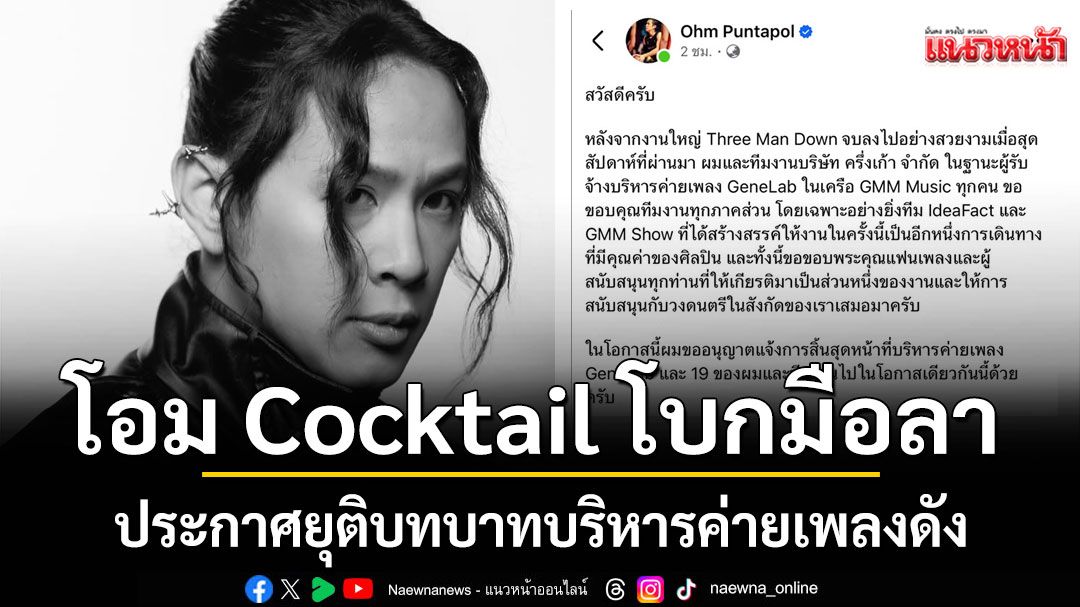 ช็อกวงการเพลง! โอม Cocktail แจ้งผ่านเฟซบุ๊กส่วนตัว ขอสิ้นสุดหน้าที่บริหารค่าย GeneLab และ 19 ในนามบริษัท “ครึ่งเก้า” หลังทำงานร่วมกับ GMM Music มาหลายปี เผยอยากออกไปทำสิ่งใหม่ในวันที่ยังมีพลังและความคิดสร้างสรรค์