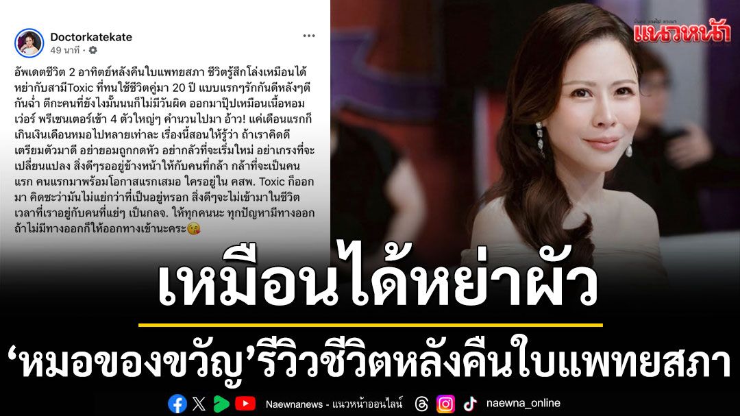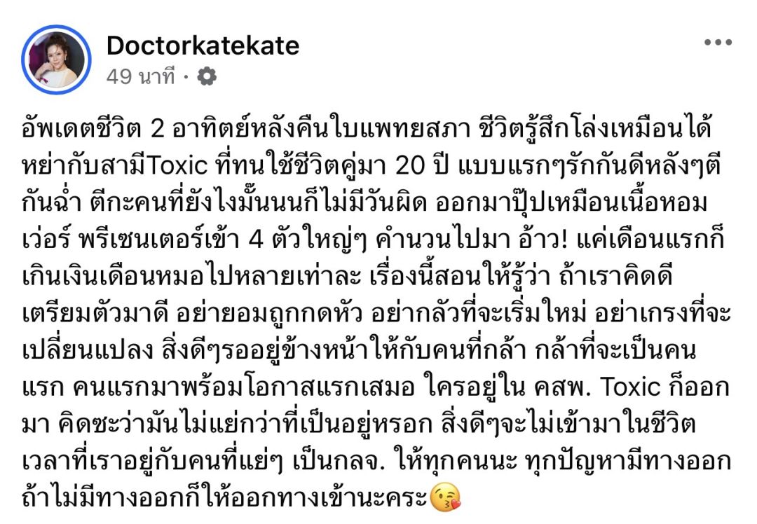 อัพเดตชีวิต 2 อาทิตย์หลังคืนใบแพทยสภา ชีวิตรู้สึกโล่งเหมือนได้หย่ากับสามีToxic ที่ทนใช้ชีวิตคู่มา 20 ปี แบบแรกๆรักกันดีหลังๆตีกันฉ่ำ ตีกะคนที่ยังไงมั๊นนนก็ไม่มีวันผิด ออกมาปุ๊ปเหมือนเนื้อหอมเว่อร์ พรีเซนเตอร์เข้า 4 ตัวใหญ่ๆ คำนวนไปมา อ้าว! แค่เดือนแรกก็เกินเงินเดือนหมอไปหลายเท่าละ เรื่องนี้สอนให้รู้ว่า ถ้าเราคิดดีเตรียมตัวมาดี อย่ายอมถูกกดหัว อย่ากลัวที่จะเริ่มใหม่ อย่าเกรงที่จะเปลี่ยนแปลง สิ่งดีๆรออยู่ข้างหน้าให้กับคนที่กล้า กล้าที่จะเป็นคนแรก คนแรกมาพร้อมโอกาสแรกเสมอ ใครอยู่ใน คสพ. Toxic ก็ออกมา คิดซะว่ามันไม่แย่กว่าที่เป็นอยู่หรอก สิ่งดีๆจะไม่เข้ามาในชีวิตเวลาที่เราอยู่กับคนที่แย่ๆ เป็นกลจ. ให้ทุกคนนะ ทุกปัญหามีทางออก ถ้าไม่มีทางออกก็ให้ออกทางเข้านะคร