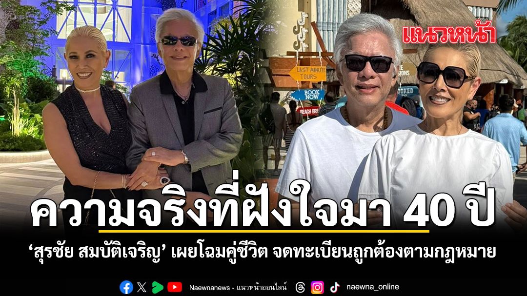 กลายเป็นเรื่องราวที่ทำเอาโซเชียลแห่แชร์และซึ้งไปตาม ๆ กัน เมื่อวานนี้ 12 มีนาคม 2569 ศิลปินรุ่นใหญ่ระดับตำนานอย่าง สุรชัย สมบัติเจริญ วัย 69 ปี ทายาทของ ครู สุรพล สมบัติเจริญ ออกมาเฉลยความลับสุดยอดที่เก็บไว้ในใจมานานกว่า 4 ทศวรรษ ที่หลังจากหายหน้าหายตาไปใช้ชีวิตที่สหรัฐอเมริกาอยู่นาน ล่าสุดเจ้าตัวได้โพสต์ภาพคู่สุดหวานพร้อมข้อความที่ทำเอาแฟนเพลงอึ้งแต่ยิ้มตามผ่านเฟซบุ๊ก โดยมีข้อความทั้งหมดว่า "นี่คือความจริง ความรู้สึกที่ฝังลึกอยู่ในจิตใจผมมากกว่า40ปี ถึงเวลาแล้วที่ผมจะต้องรักษาคู่ชีวิตของผม และอยู่เคียงข้างกับเธอตลอดไป ตลอดระยะเวลากว่า 40 ปีที่ผ่านมา ไดอาน่า สมบัติเจริญ คือภรรยาที่ผมได้จดทะเบียนสมรสอย่างถูกต้องตามกฎหมาย ณ ประเทศสหรัฐอเมริกา แม้ในช่วงหนึ่งของชีวิต เราจำเป็นต้องแยกกันอยู่ด้วยเหตุผลและภาระหน้าที่ที่ผมต้องรับผิดชอบในเวลานั้น แต่ความสัมพันธ์ของเรายังคงอยู่ด้วย ความเคารพและความเข้าใจเสมอมา และเราไม่เคยหย่าร้างจากกัน