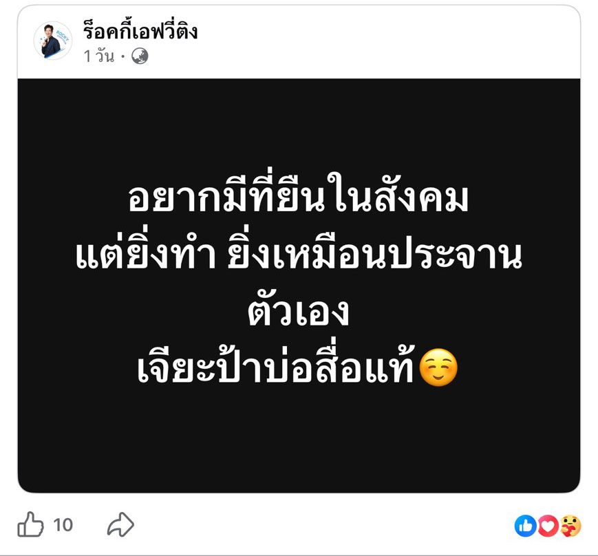 ถามว่าจะบอกว่าคนที่โพสต์เนี่ยจะโพสต์ทำไมเหรอ ร็อคกี้ ยอมรับว่า “ใช่ คนเราไม่ต้องดิ้น ทองไม่ต้องบอกคนอื่นว่าเป็นทอง เพราะสุดท้ายทองมันก็มีค่าในตัว ถ้ามันเป็นขี้มันก็พยายามบอกว่าตัวเองเป็นทอง ยิ่งเป็นขี้แล้วไปป่าวประกาศว่าฉันเป็นทองมากเท่าไหร่ คนก็ยิ่งได้กลิ่นเหม็นมากเท่านั้น ก็คิดในใจว่าเราควรต้องไปยุ่งกับมันมากมั้ย หรืออยู่ในโลกของเราอย่างมีความสุขต่อไป ”