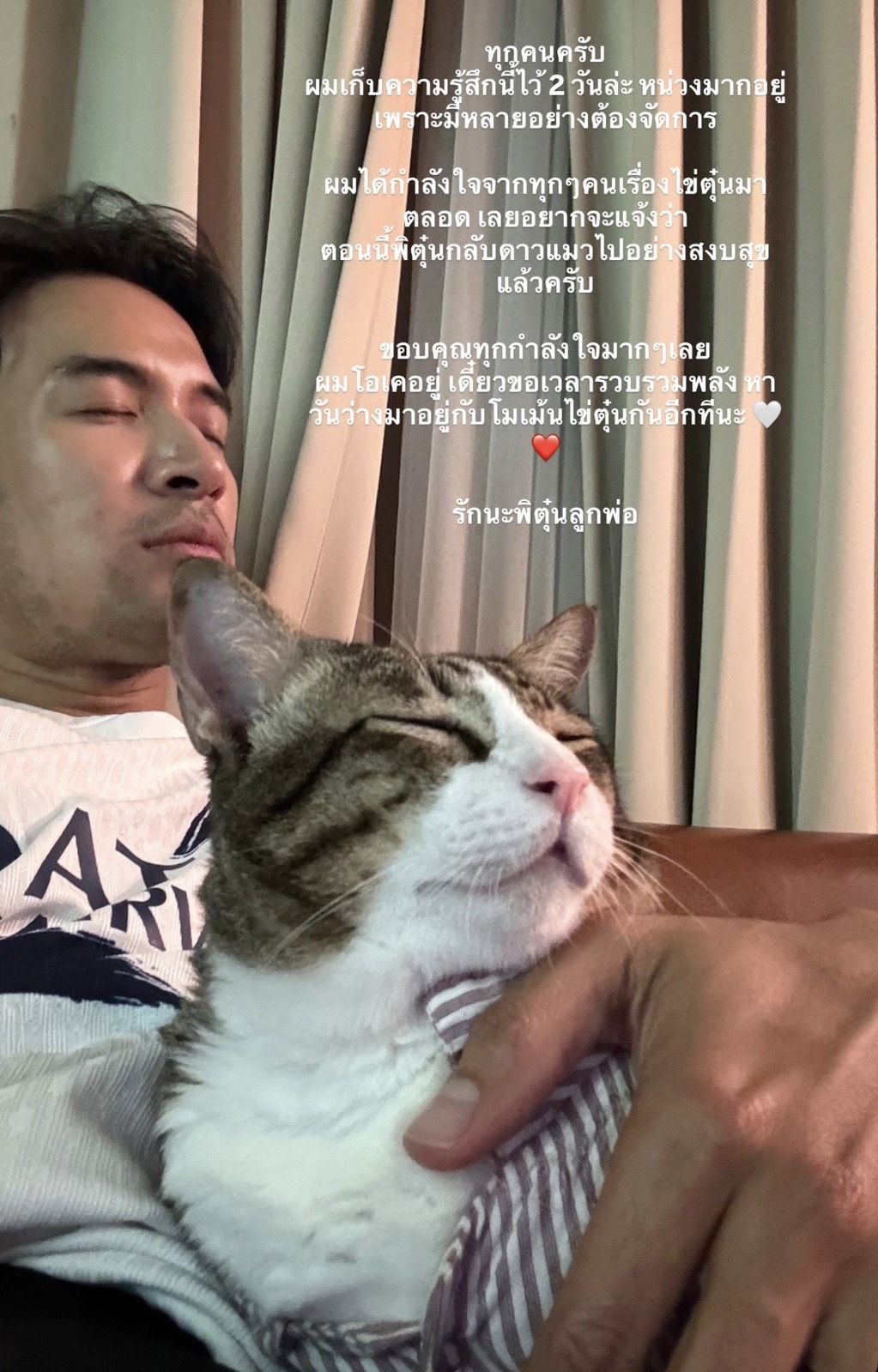 โดยหนุ่มเกรท ได้โพสต์ข้อความผ่านสตอรี่ไอจีไว้ว่า ทุกคนครับผมเก็บความรู้สึกนี้ไว้2วันล่ะ หน่วงมากอยู่เพราะหลายอย่างต้องจัดการ ผมได้กำลังใจจากทุกๆคนเรื่องไข่ตุ๋นมาตลอดเลยอยากจะแจ้งว่าตอนนี้พิตุ๋นกลับดาวแมวปอย่างสงบสุบแล้วครับ ขอบคุณทุกกำลังใจมาก ๆเลยผมโอเคอยู่เดี๋ยวจองเวลารวบรวมพลังหาวันว่างมาอยู่กับโมเม้นไข่ตุ๋นอีกทีนะ รักนะพิตุ๋นลูกพ่อ