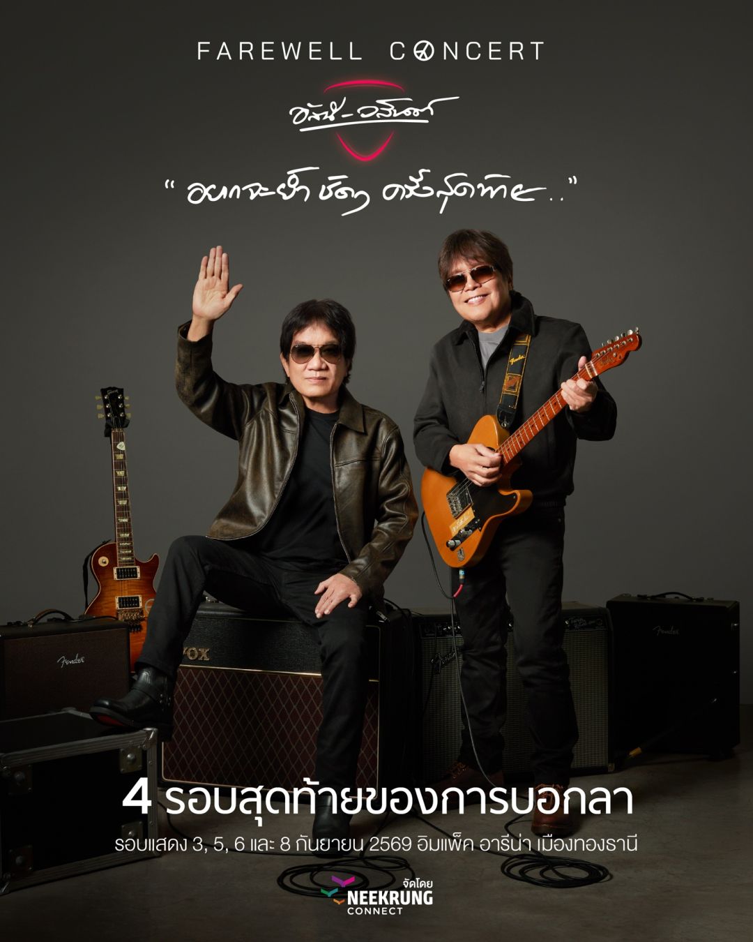 มาร่วมร้องและอินไปกับเพลงฮิตของ ‘อัสนีและวสันต์’ ที่อยู่ในความทรงจำของทุกคนให้กระหึ่มฮอลล์ ในFAREWELL CONCERT อัสนีและวสันต์ “อยากจะย้ำ ชัดๆ ครั้งสุดท้าย . .” จะจัดขึ้นวันที่ 3, 5-6 กันยายน และรอบการกุศลมูลนิธิรามาธิบดีฯ ในวันที่ 8 กันยายนนี้ ณ อิมแพ็ค อารีนา เมืองทองธานี จำหน่ายบัตรพร้อมกัน วันเสาร์ที่ 4 เมษายนนี้ ตั้งแต่เวลา 10:00 น. เป็นต้นไป ที่ไทยทิกเก็ตเมเจอร์ทุกสาขา หรือช่องทางออนไลน์สามารถติดตามรายละเอียดเพิ่มเติมได้ทาง FB : Neekrung / IG : Neekrung / TikTok : Neekrung