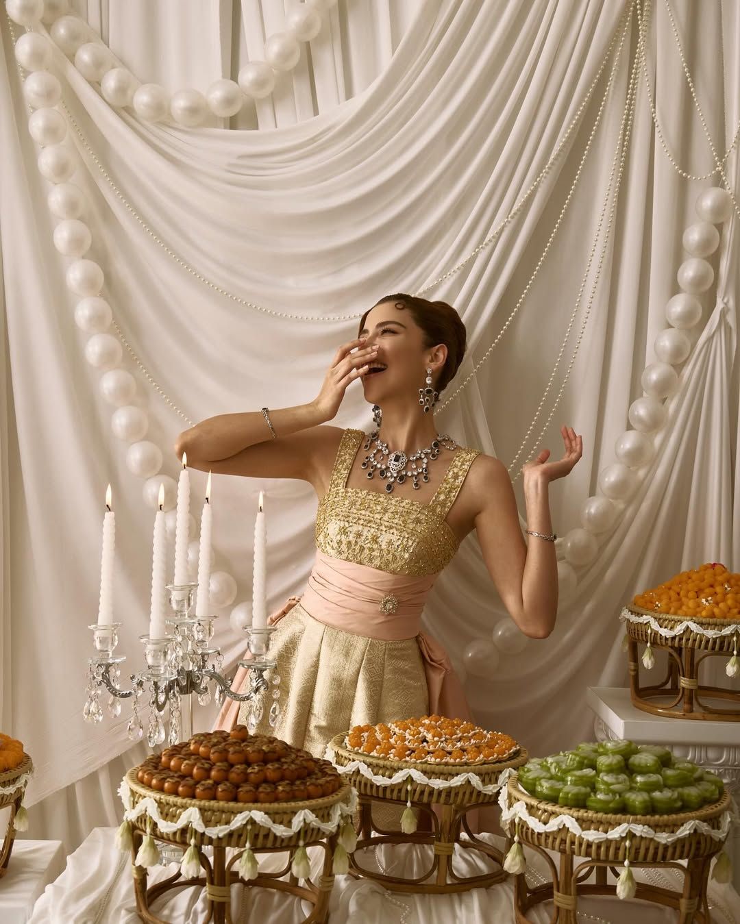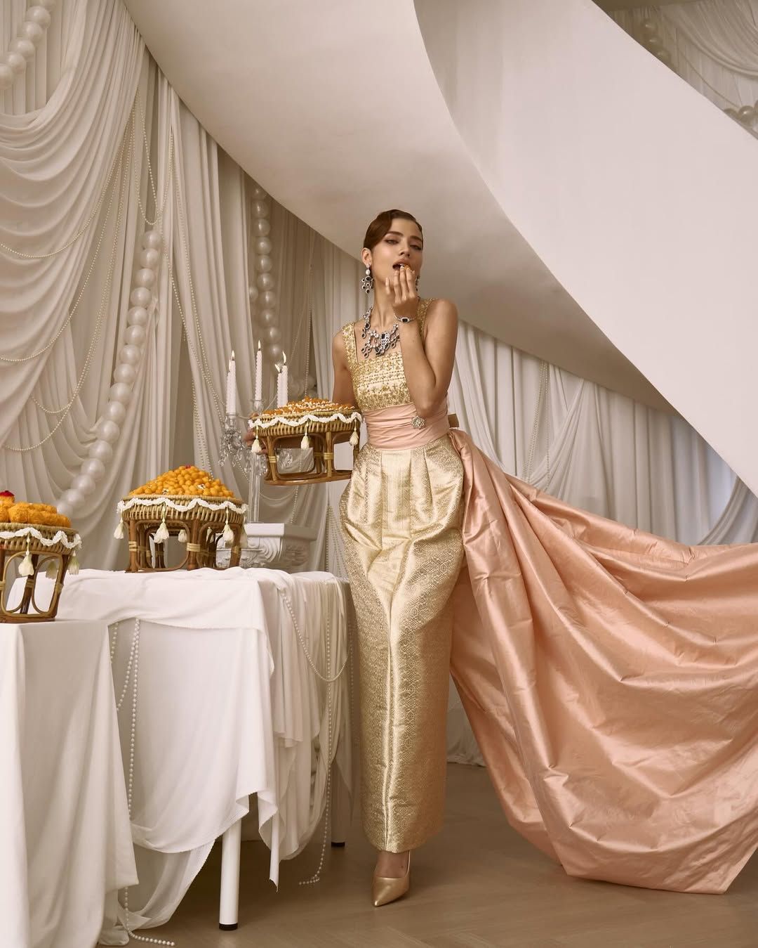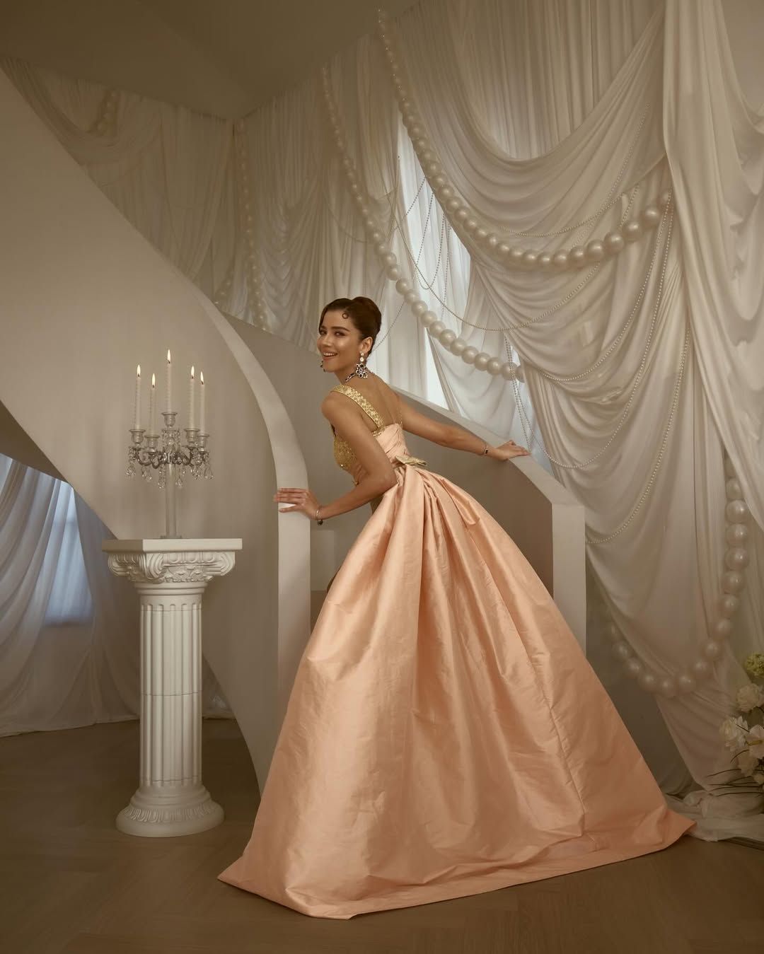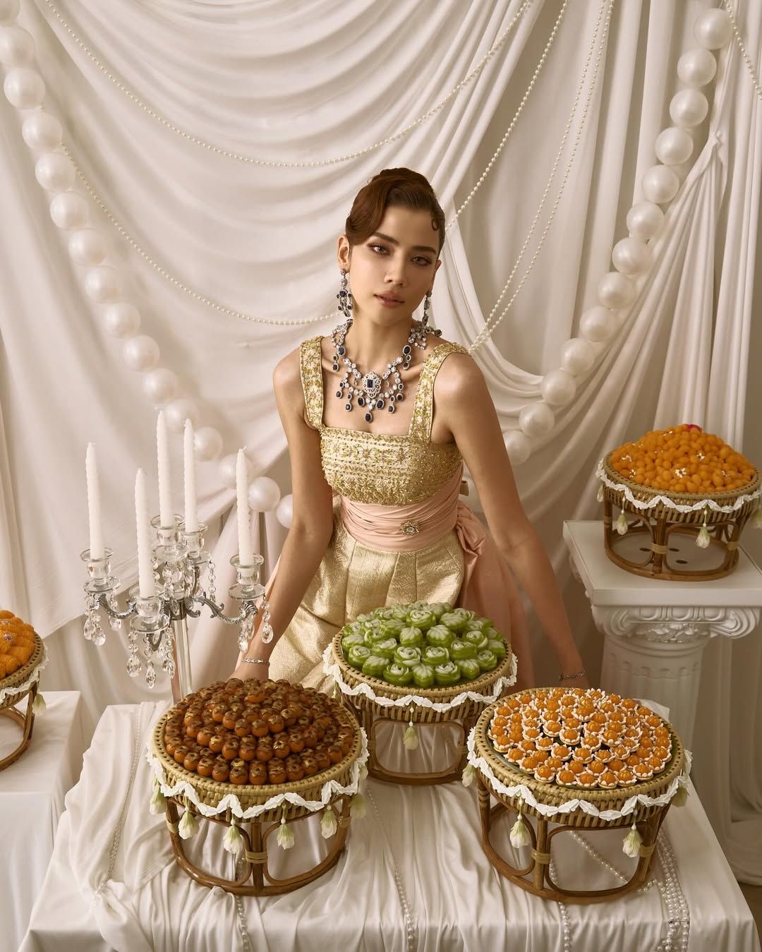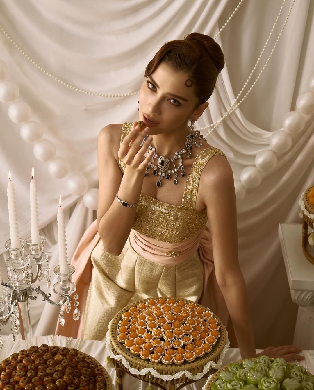 นอกจากนี้ บรรยากาศภายในเซตภาพยังถูกเนรมิตให้ละมุนละไมราวกับฉากในเทพนิยาย ไม่ว่าจะเป็นผ้าม่านสีขาว เทียนไข หรือขนมหวานที่จัดวางอย่างประณีต ยิ่งเสริมให้ภาพรวมดูหรูหราและโรแมนติกในสไตล์เจ้าหญิง