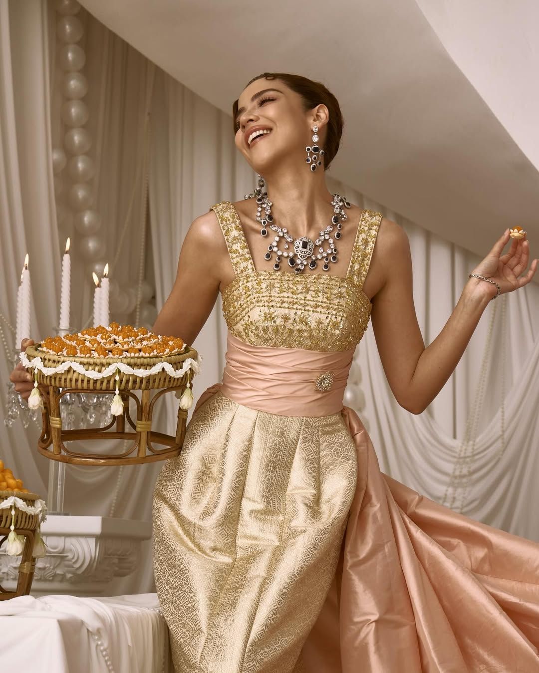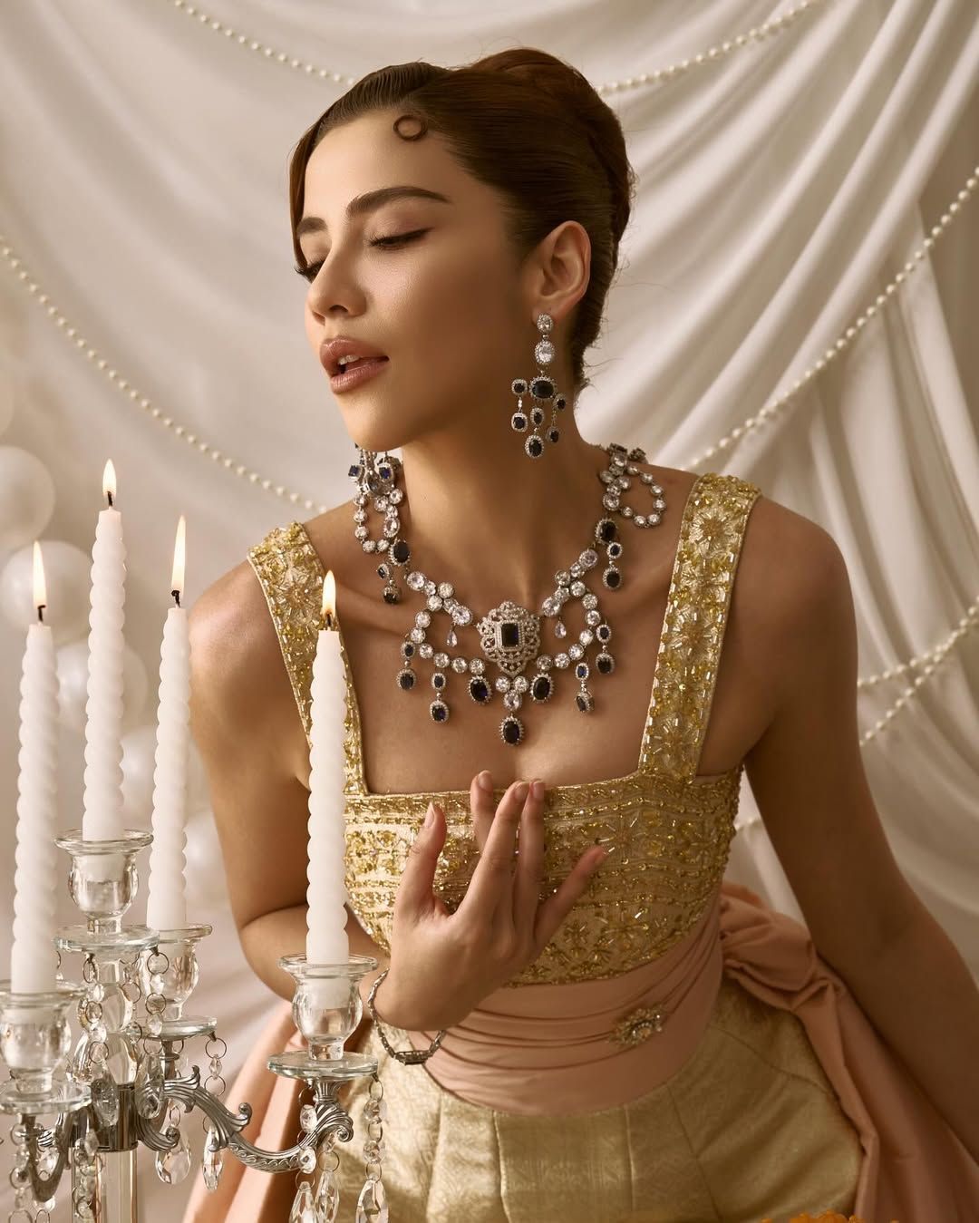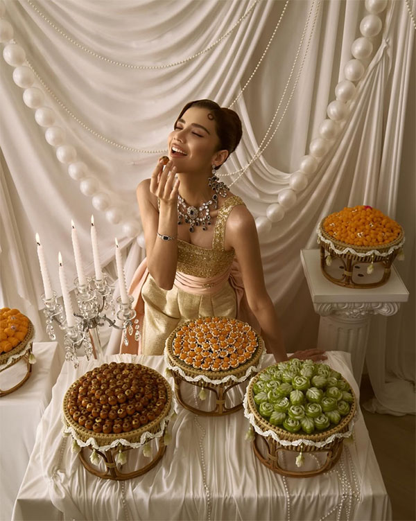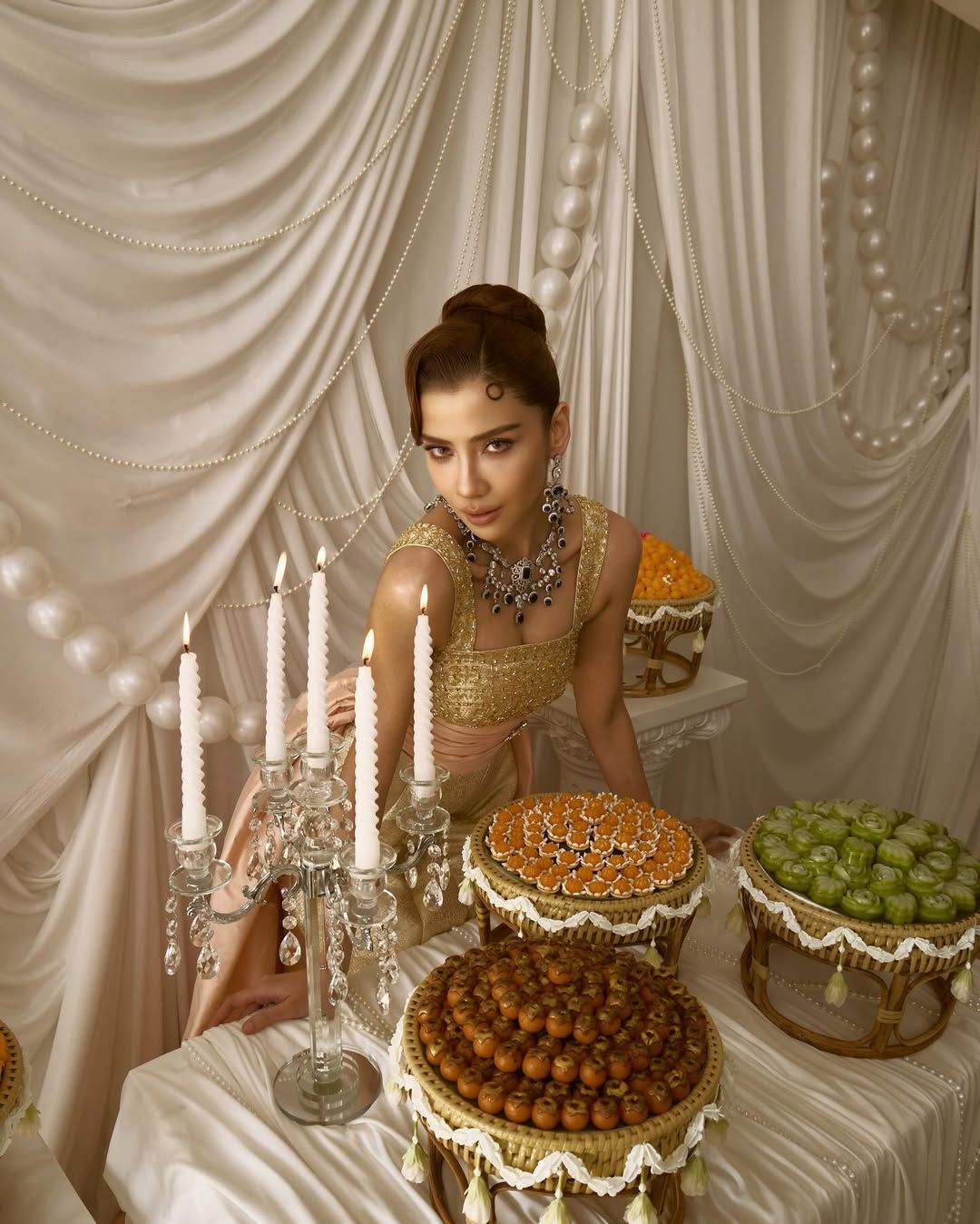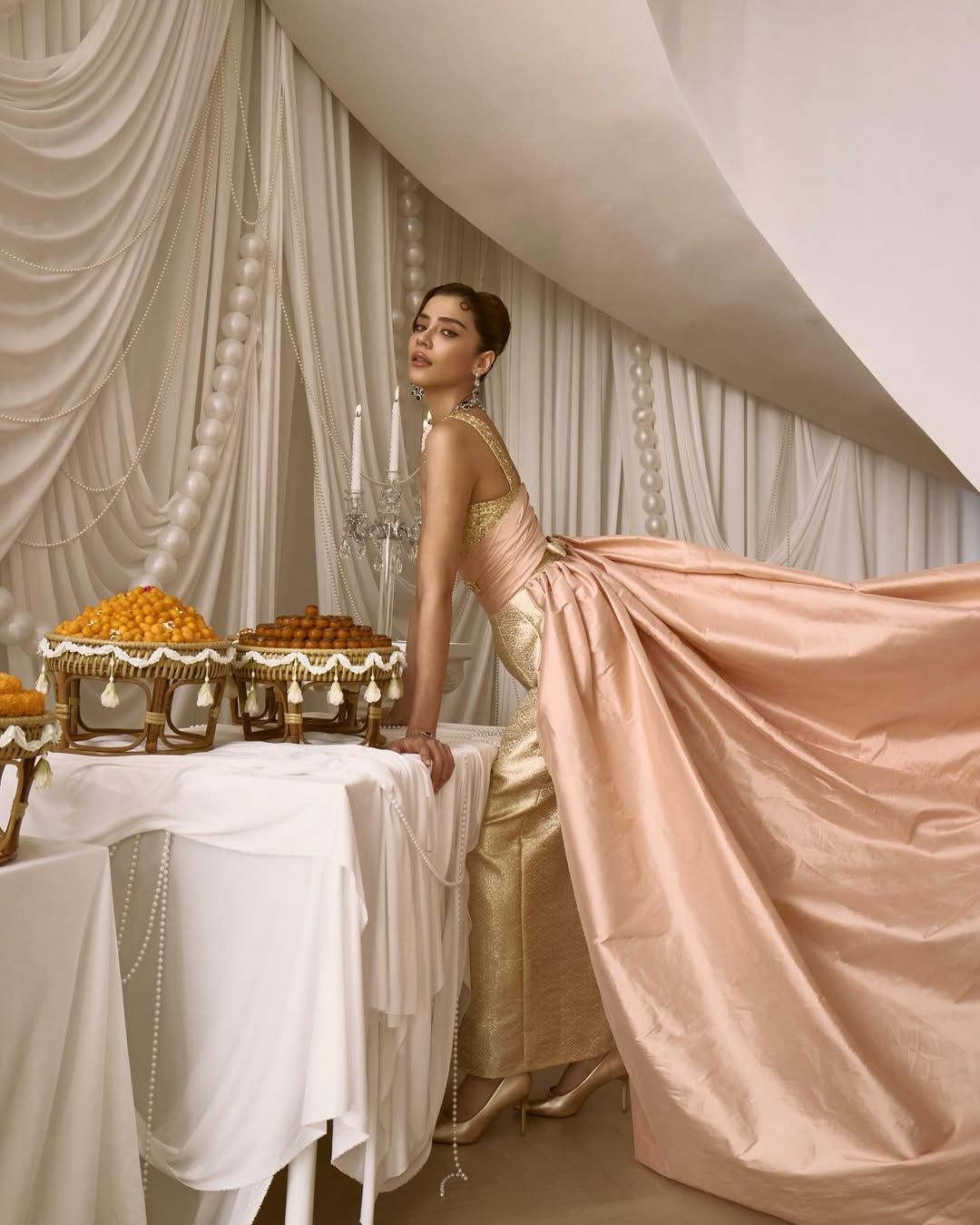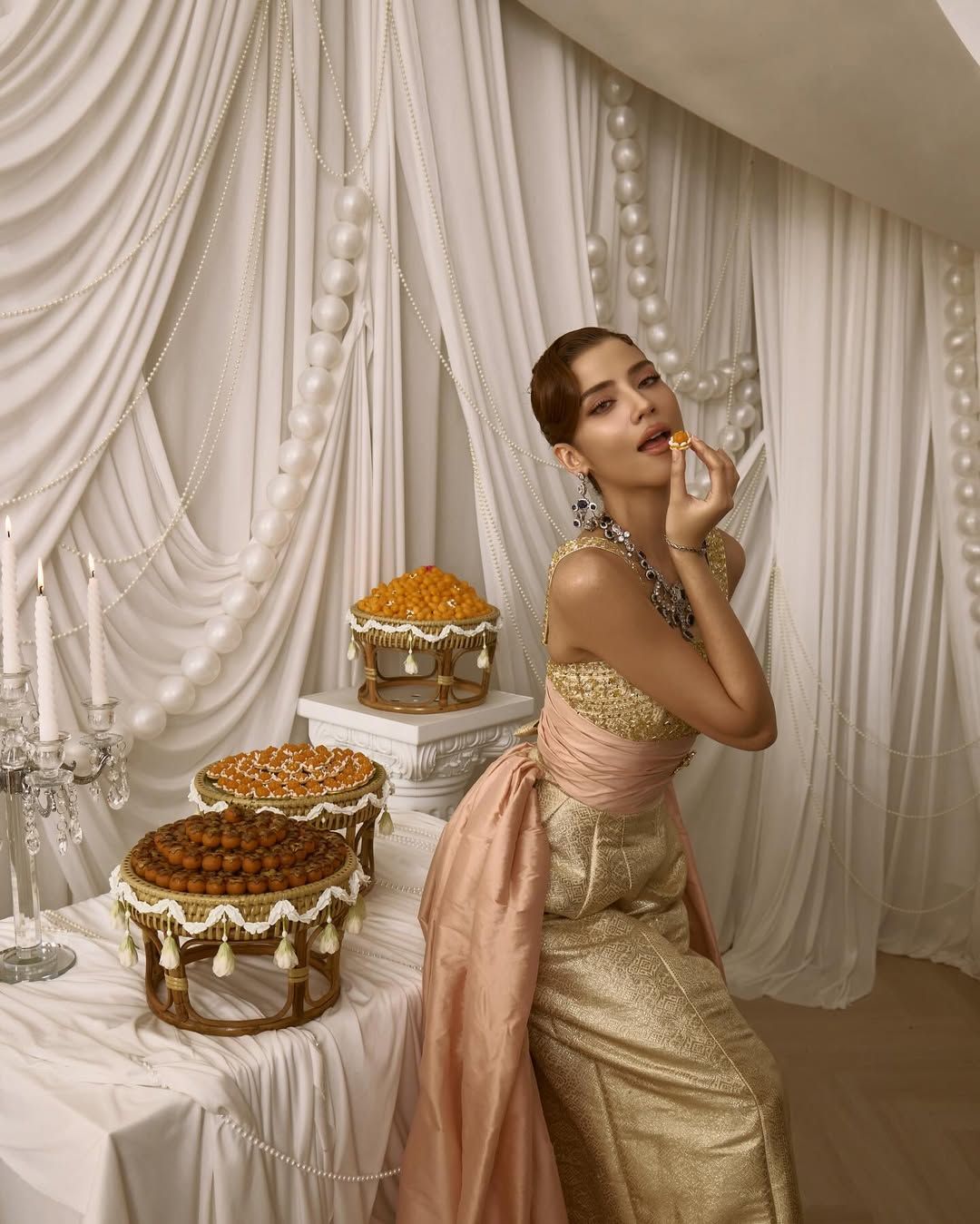 นอกจากนี้ บรรยากาศภายในเซตภาพยังถูกเนรมิตให้ละมุนละไมราวกับฉากในเทพนิยาย ไม่ว่าจะเป็นผ้าม่านสีขาว เทียนไข หรือขนมหวานที่จัดวางอย่างประณีต ยิ่งเสริมให้ภาพรวมดูหรูหราและโรแมนติกในสไตล์เจ้าหญิง