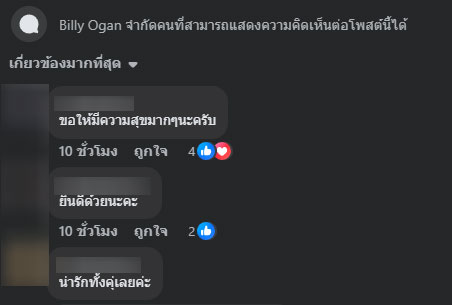 หลังจากโพสต์เผยแพร่ออกไป แฟนคลับจำนวนมากต่างเข้ามาคอมเมนต์แสดงความยินดี พร้อมอวยพรให้เจ้าตัวมีความสุขในความรัก โดยมีแฟนคลับรายหนึ่งระบุว่า “คุณบิลลี่รักใครเราก็รักด้วยค่ะ ขอให้ดูแลกันจนแก่เฒ่านะคะ” ซึ่ง บิลลี่ โอแกน ก็ได้ตอบกลับอย่างอบอุ่นว่า ข้อความดังกล่าวทำให้นึกถึงคำพูดของคุณแม่ในวันที่ตนอกหักครั้งแรก